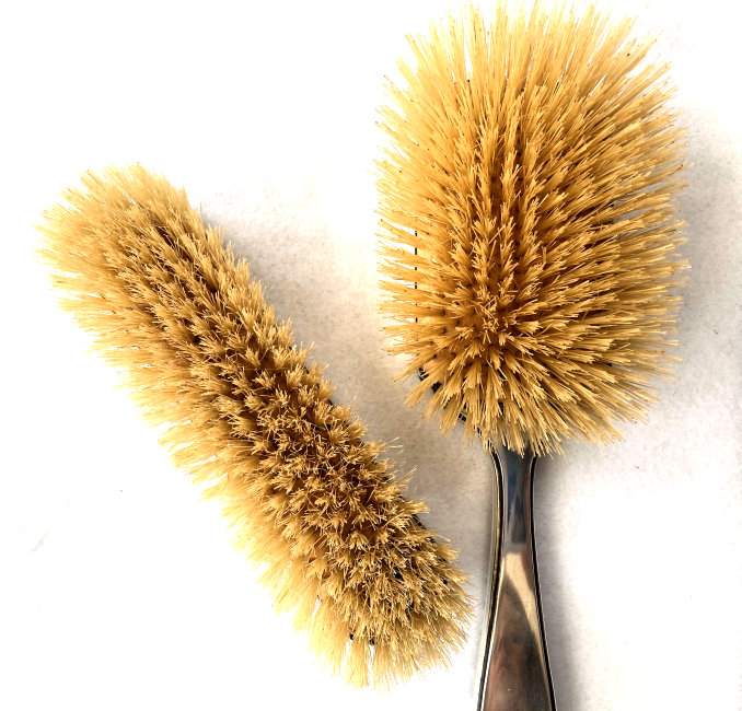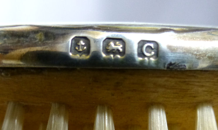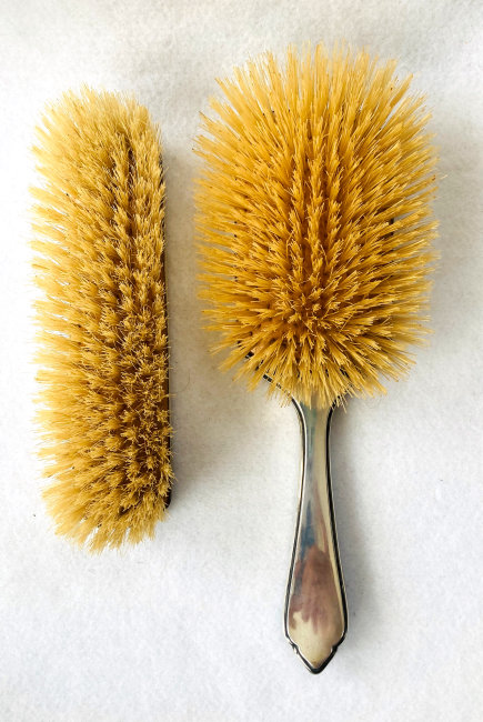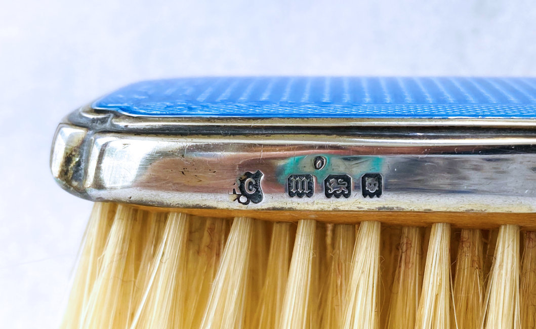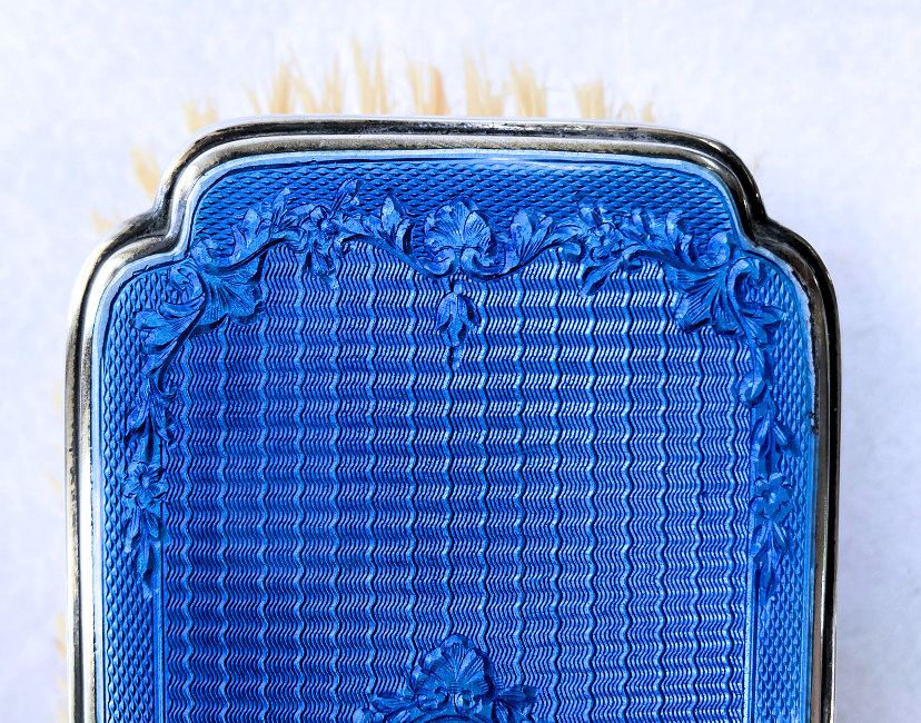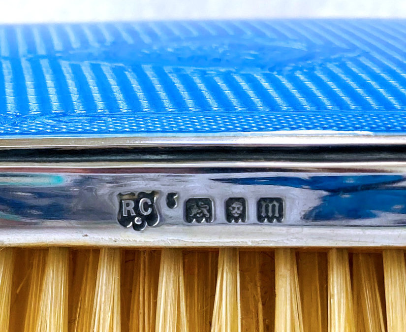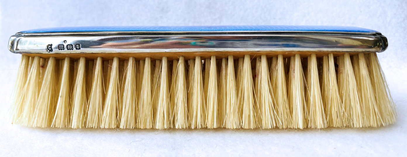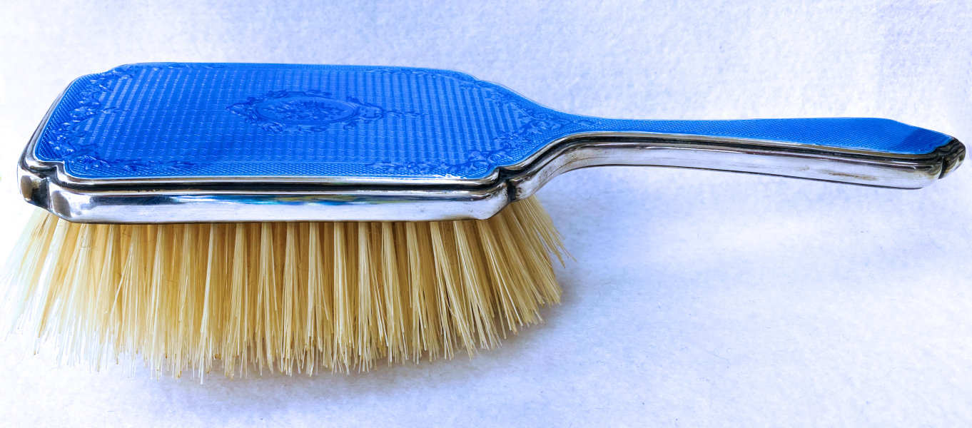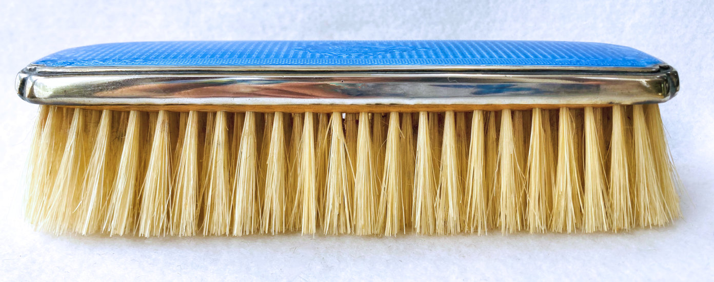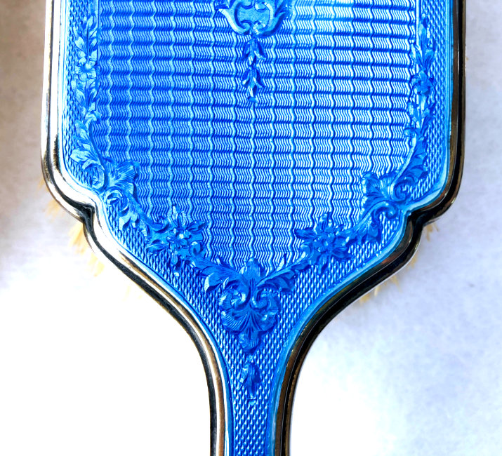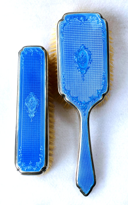 Here is a wonderful pair of blue enamel guilloche brushes on sterling silver mounts done by Richard Comyns of London. Both pieces are hallmarked to the year 1927. The enamel is all in fabulous condition with only a few insignificant scratches only visible when caught in the light. The detail in the design is exquisite. The bristles are natural and in excellent condition as well. This set is very clean and could easily be used today. Or just place it on your vanity to enjoy looking at it as I have. The hairbrush measures almost 9" long x 2-1/2" wide and the clothes brush measures 6-1/4" long x 1-5/8" wide. First time offered! (Click on pic for more photos.) |