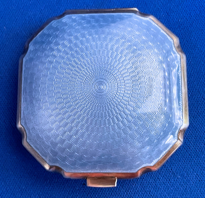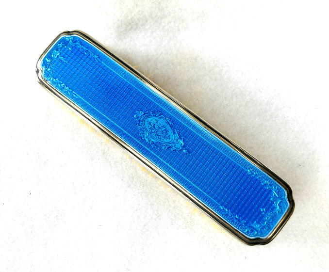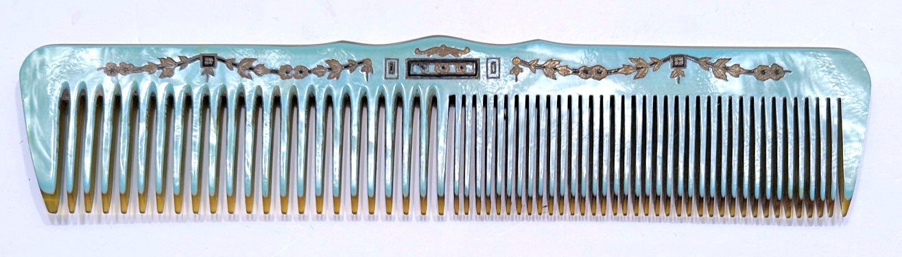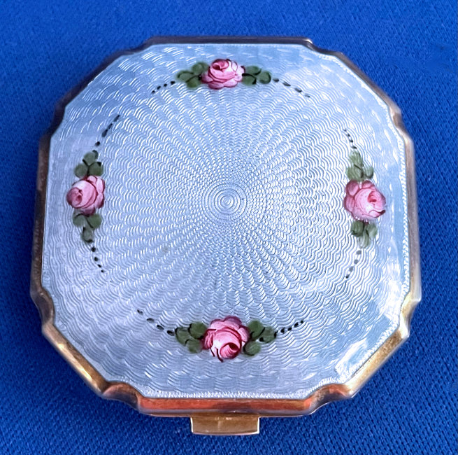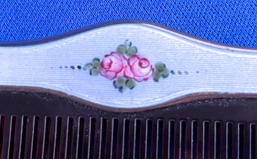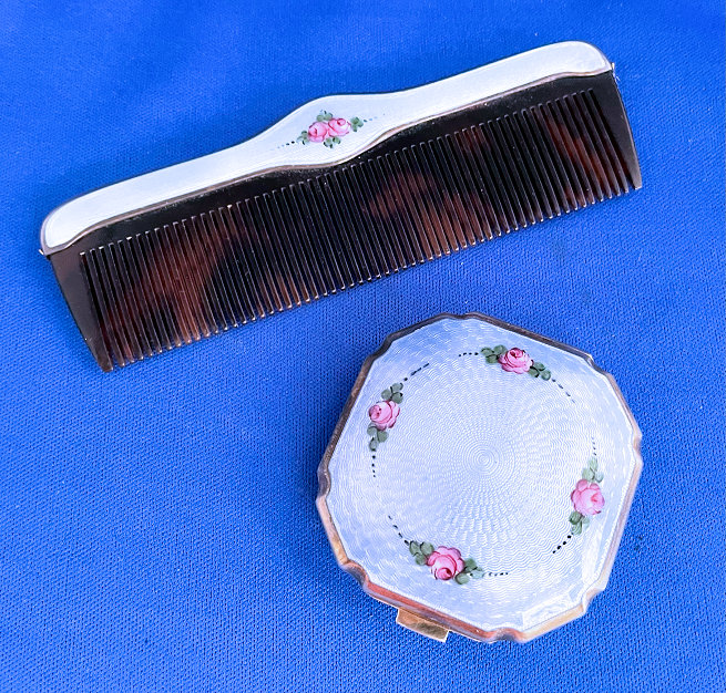 This lovely little set has a matching octagon shaped compact and comb with baby blue enamel guilloche with hand-painted roses. The compact is marked LaMode on the frame inside. It is in a fitted case. The compact has a covered powder well with loose powder still inside as well as a beautifully damascened cover over the rouge pot which also has a mirror on the reverse. Both original puffs are still intact. The comb is a faux tortie and has the same lovely baby blue enamel guilloche with hand-painted roses. It is in excellent condition with no discernible damage that I can see. The case has very minor wear to the outside as shown in the pictures. Comb measures 4-5/8" x 1-1/2"; compact is 2" square. Case is 5" x 3-1/4". (Click on pic for more photos.) |