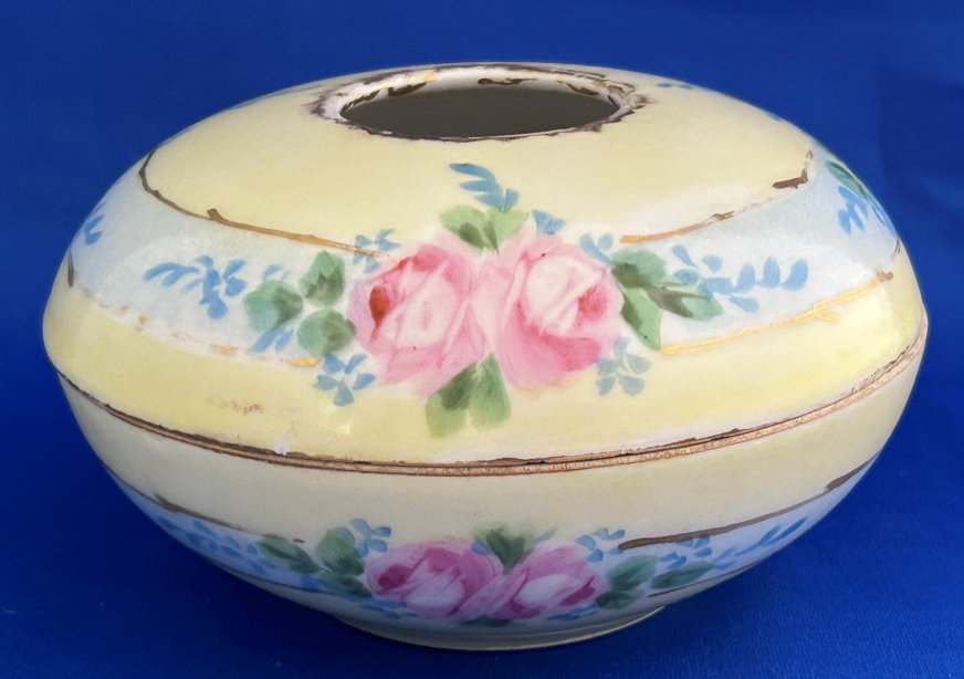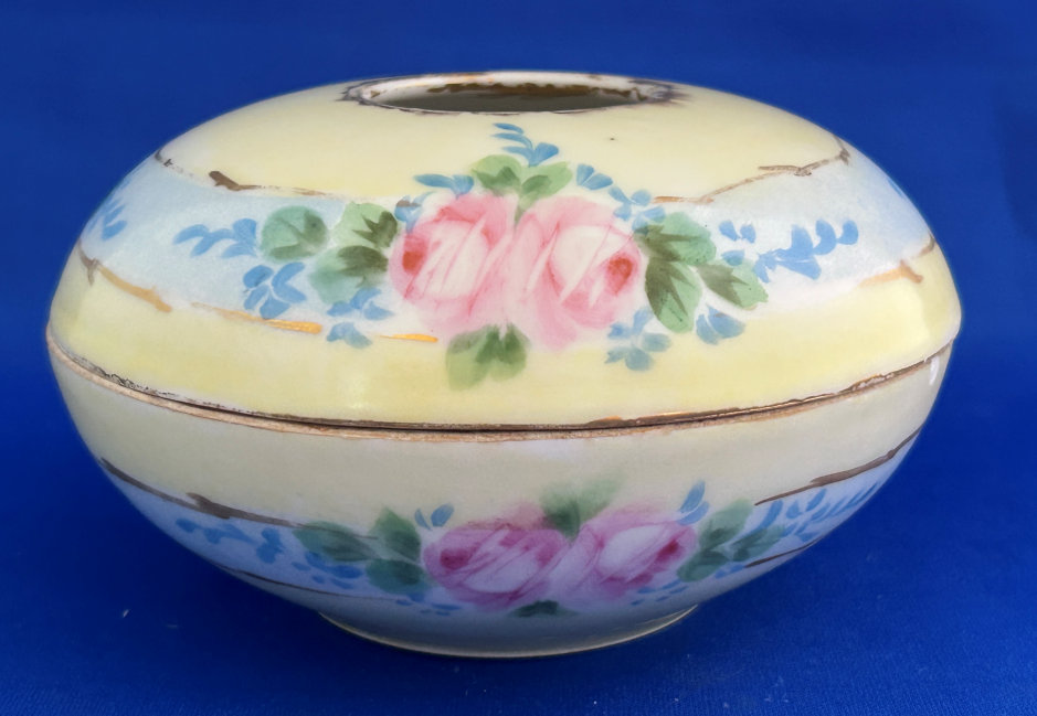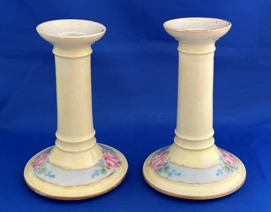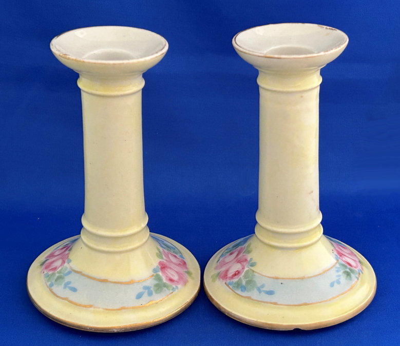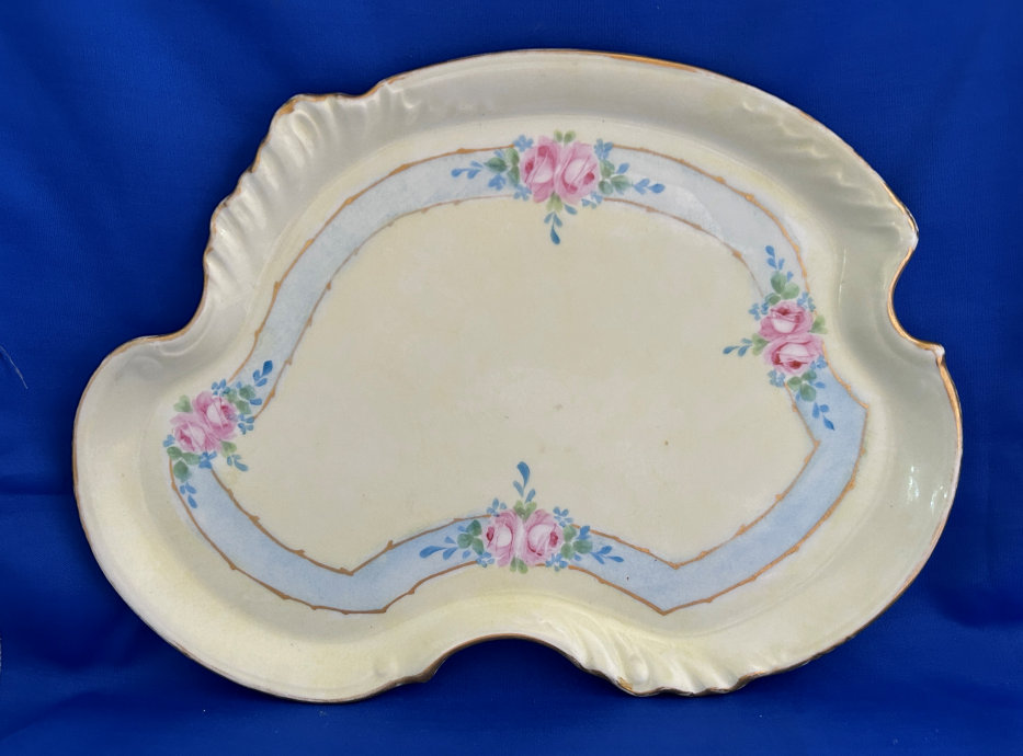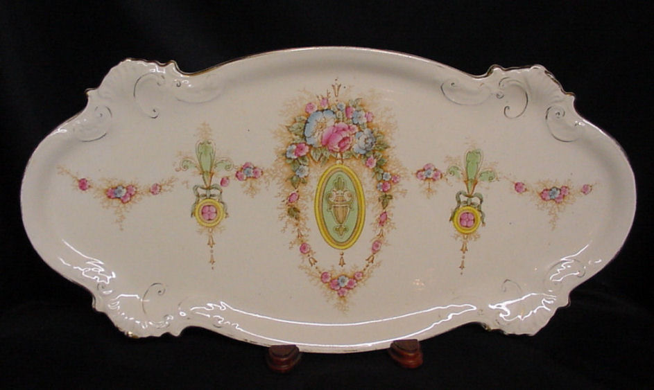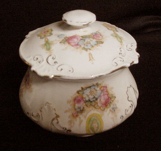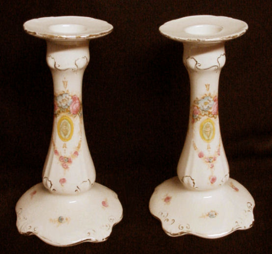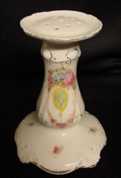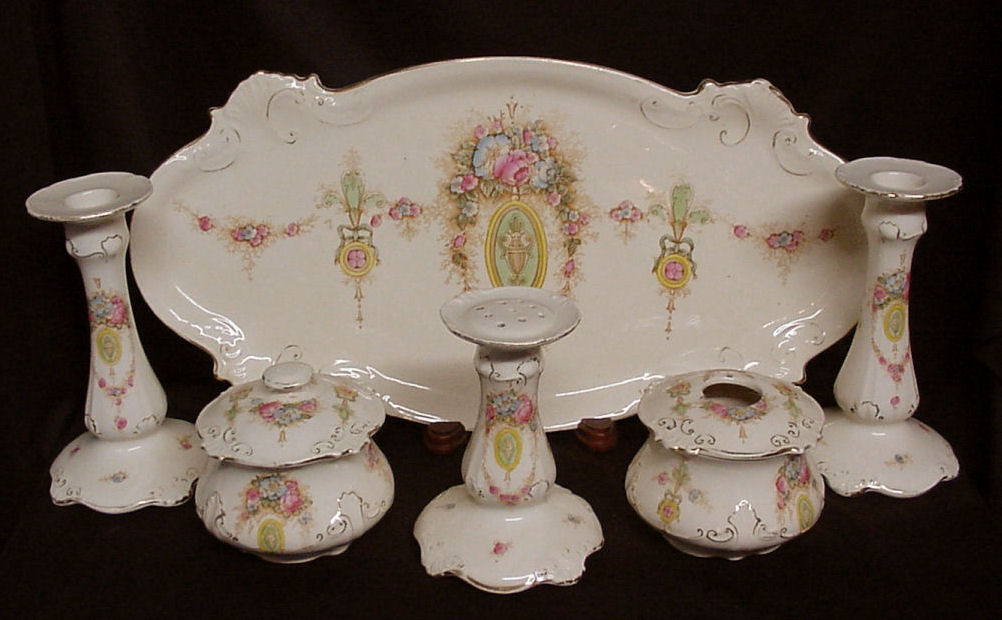 Of all the vanity sets I have owned, this one has to be my absolute favorite! Probably because the date on the bottom dates its manufacture to 1912, the year the Titanic embarked on its historic voyage. I just love the colors and the designs on this. It was made by S. Fielding & Company in Stoke-on-Trent, England. The 8-pc. set consists of a large shaped tray, pair of candle holders, hatpin holder, hair receiver and covered powder jar (lids count as part of set). Amazingly, ALL of the pieces are in excellent condition with no chips or cracks ... almost unheard of in a set of this size and age. The only sign of age at all is the slight wear to the gold gilt edging, all clearly visible in the pictures above. I believe "Lune" is the name of the design. Below are the measurements of each piece: