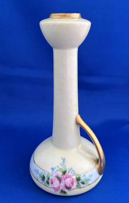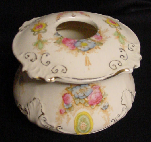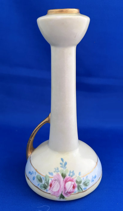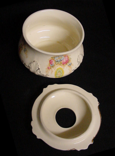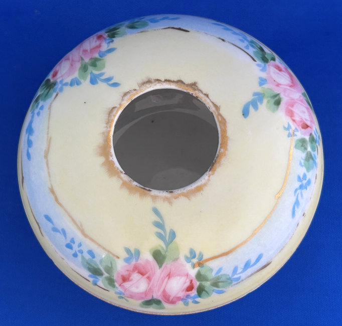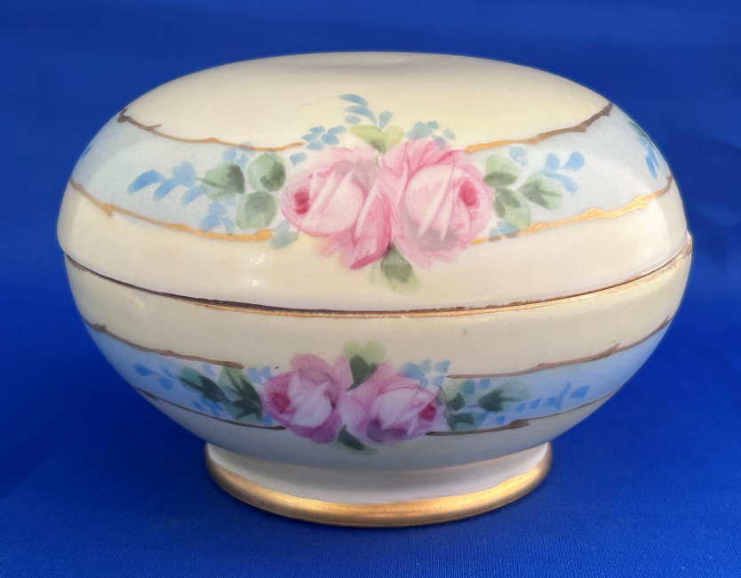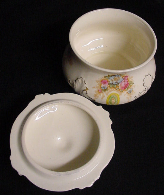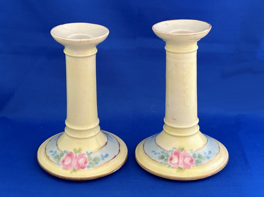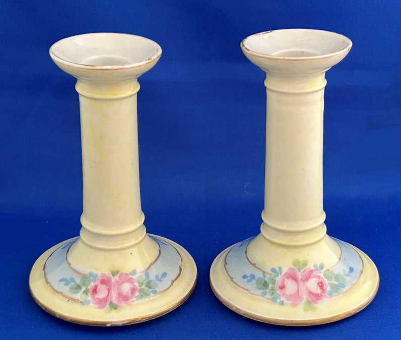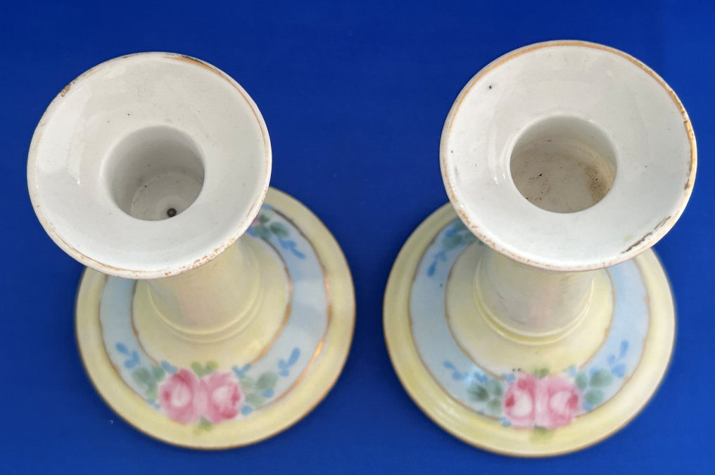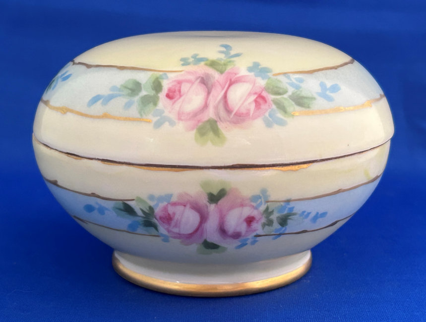 Of all the vanity sets I have owned, this one has to be my absolute favorite! Probably because the date on the bottom dates its manufacture to 1912, the year the Titanic embarked on its historic voyage. I just love the colors and the designs on this. It was made by S. Fielding & Company in Stoke-on-Trent, England. The 8-pc. set consists of a large shaped tray, pair of candle holders, hatpin holder, hair receiver and covered powder jar (lids count as part of set). Amazingly, ALL of the pieces are in excellent condition with no chips or cracks ... almost unheard of in a set of this size and age. The only sign of age at all is the slight wear to the gold gilt edging, all clearly visible in the pictures above. I believe "Lune" is the name of the design. Below are the measurements of each piece: