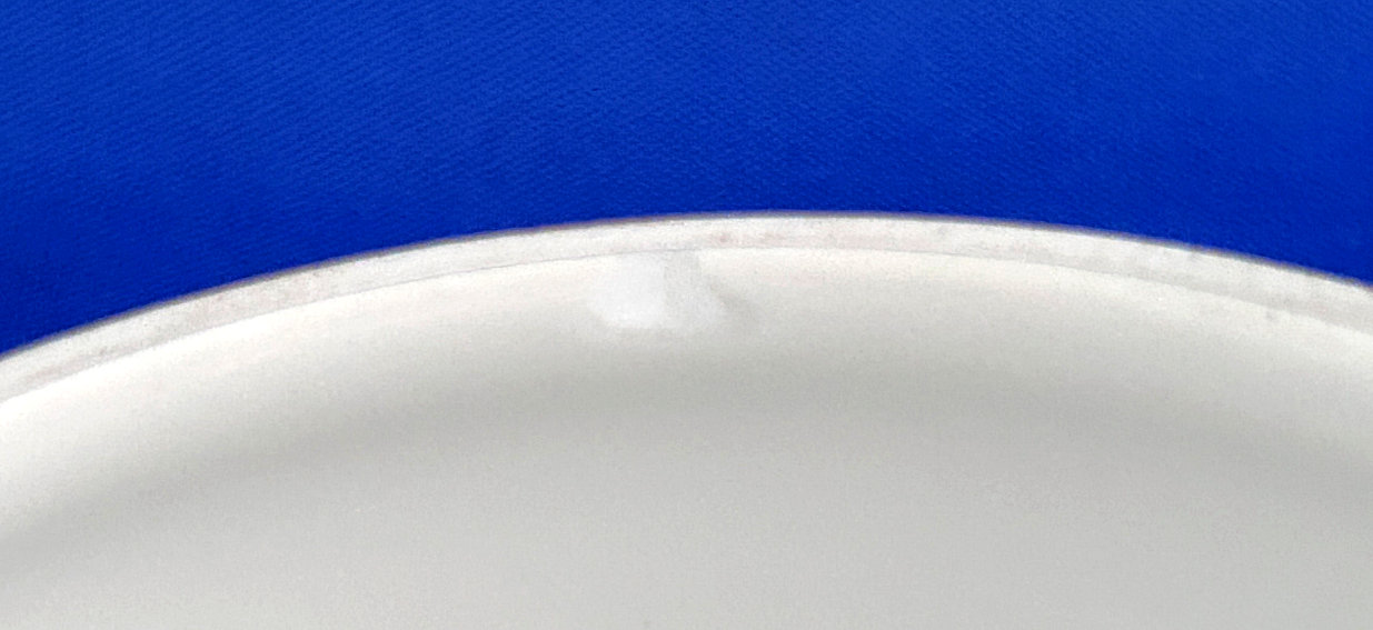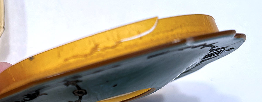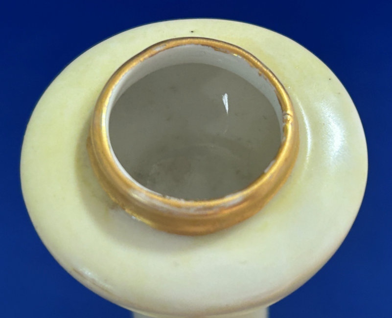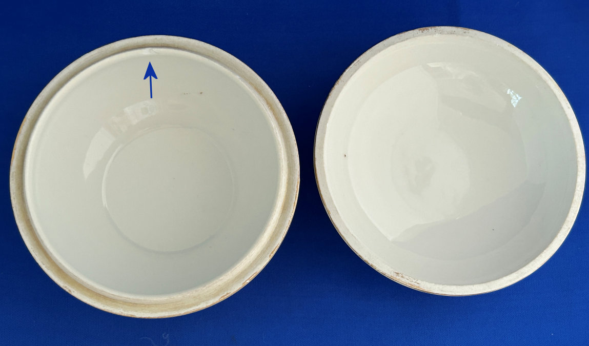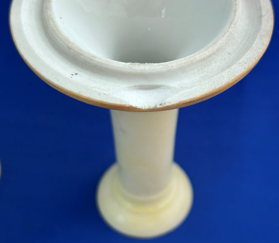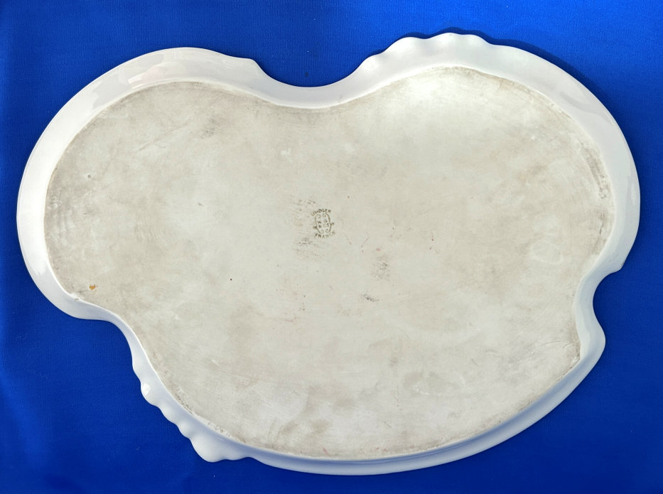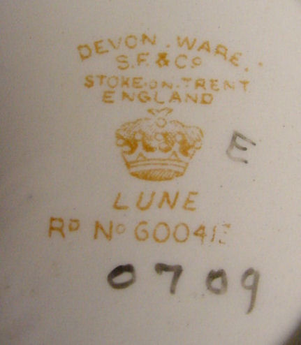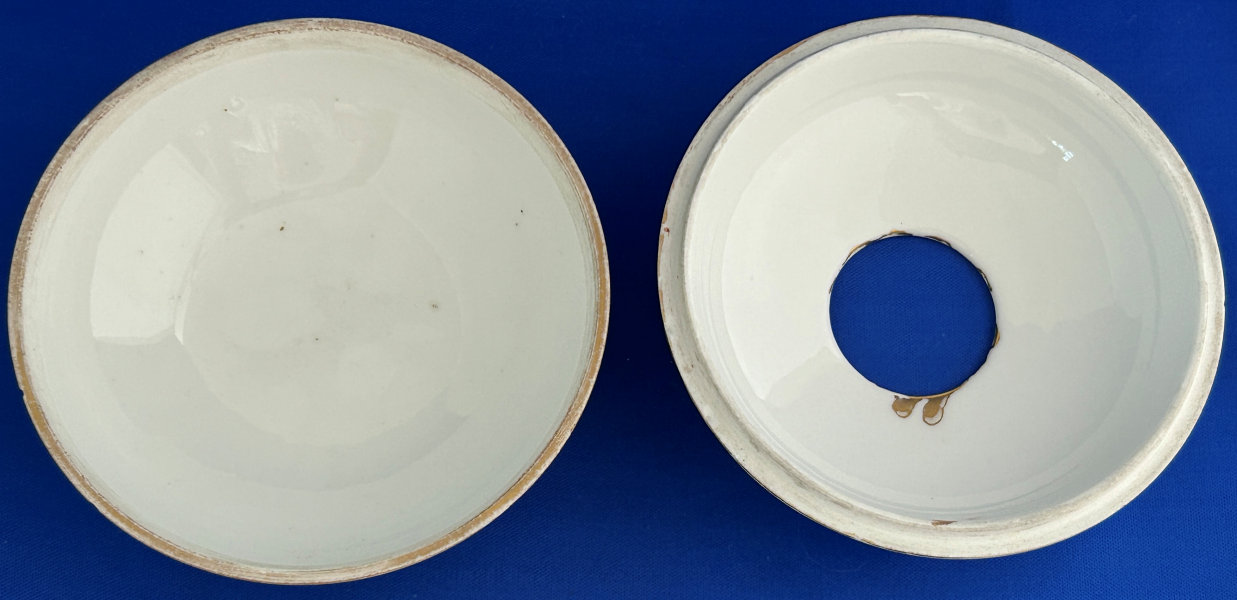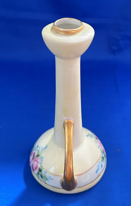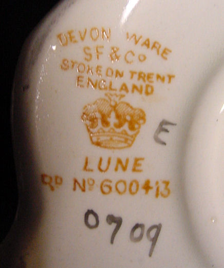Of all the vanity sets I have owned, this one has to be my absolute favorite! Probably because the date on the bottom dates its manufacture to 1912, the year the Titanic embarked on its historic voyage. I just love the colors and the designs on this. It was made by S. Fielding & Company in Stoke-on-Trent, England. The 8-pc. set consists of a large shaped tray, pair of candle holders, hatpin holder, hair receiver and covered powder jar (lids count as part of set). Amazingly, ALL of the pieces are in excellent condition with no chips or cracks ... almost unheard of in a set of this size and age. The only sign of age at all is the slight wear to the gold gilt edging, all clearly visible in the pictures above. I believe "Lune" is the name of the design. Below are the measurements of each piece: