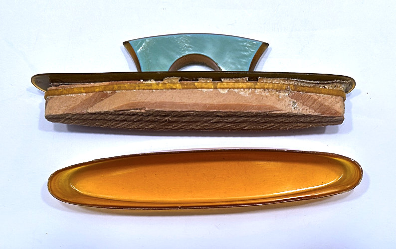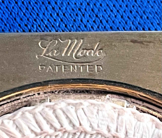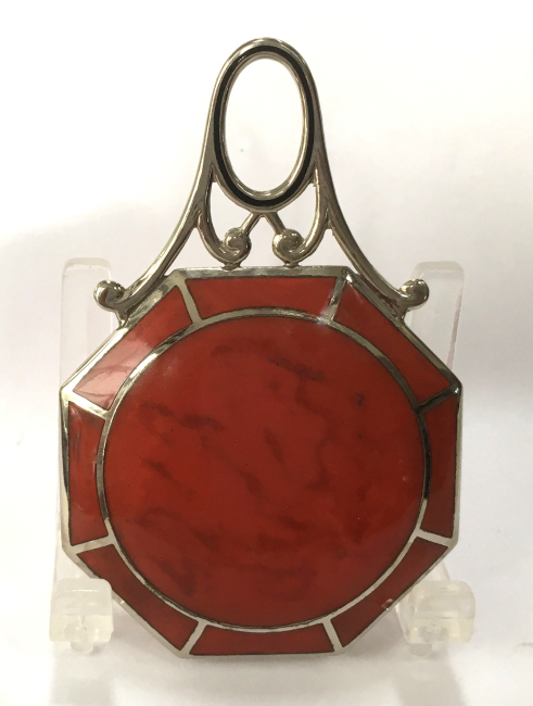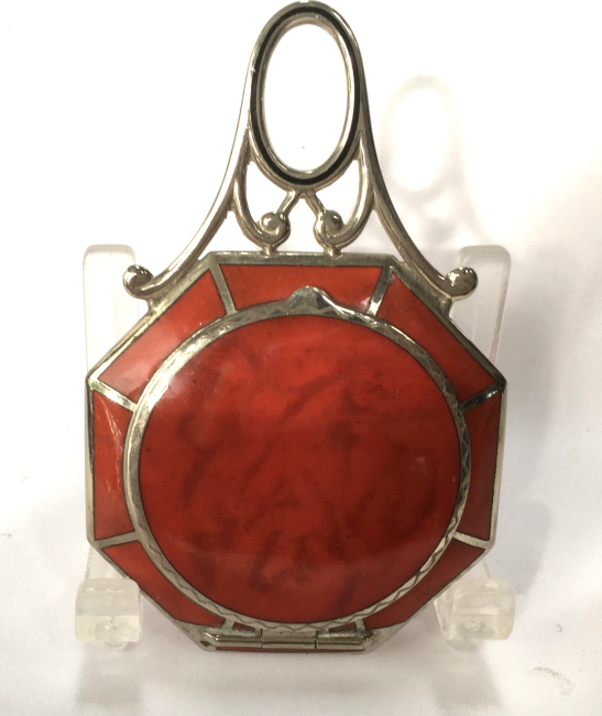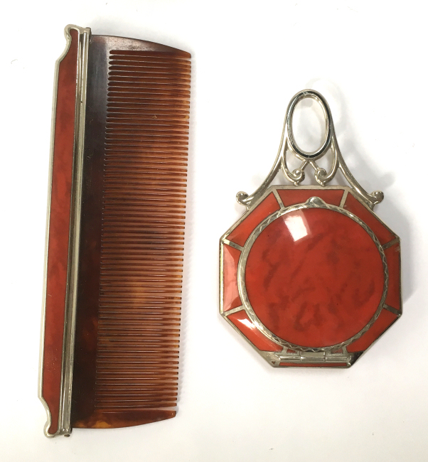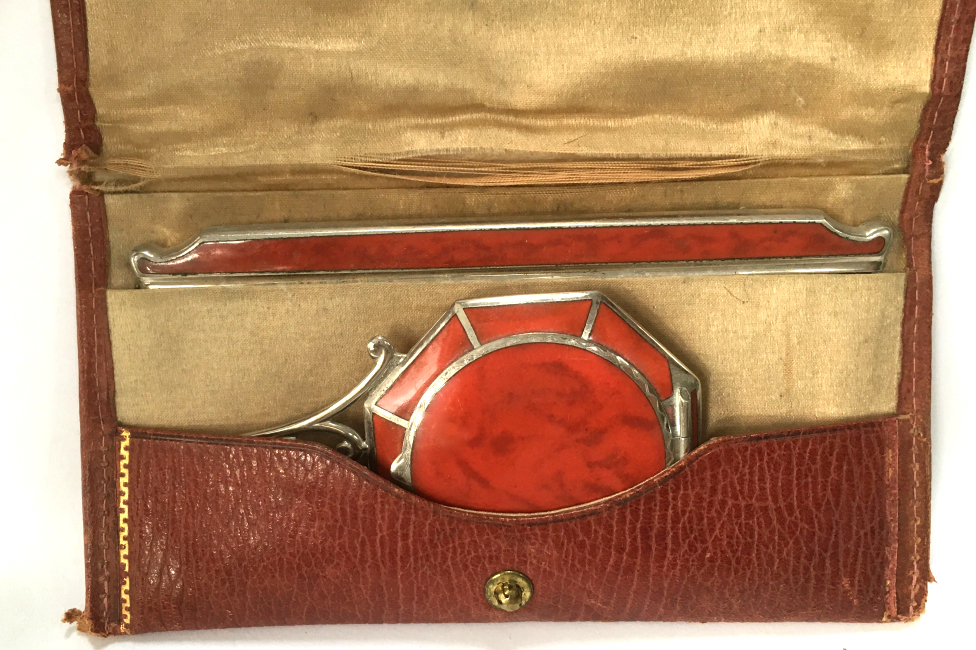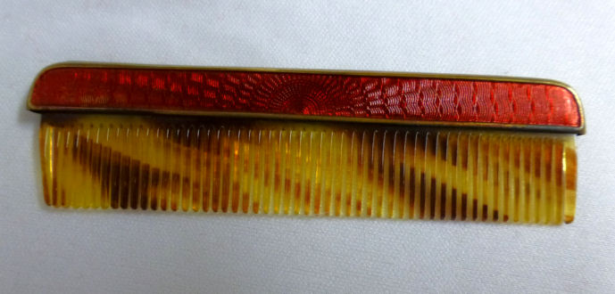 This lovely little set has a matching octagon shaped compact and comb with tomato red enamel in a two-tone design. The compact is marked R & G Co. on the frame inside which denotes it was made by Ripley & Gowan of Attleboro, Massachusetts. It is in a fitted case which is marked LaMode, which was part of the R & G line. The compact has a rigid handle with a thin band of black accenting the round portion. The compact has a rotating sifter inside with a mirror in the lid and an original puff still intact. The comb is a faux tortie and has the same lovely tomato red two-tone enamel holder. It is in excellent condition with only one or two very minute (teeny) scratches near the edges on the compact front. I had to use a loupe with the light at an angle to even see them as it appears mint to my naked eye. The mirror does have age appropriate fogging as is typical. The case has some wear to the outside as shown in the pictures and the silk lining is split at the fold where the lid flap closes. Other than that it is in good shape. Comb measures 4-5/8" x 1-5/8"; compact is 2" diameter plus 1" for the handle. Case is 5-1/4" x 2-7/8". (Click on pic for more photos.) |