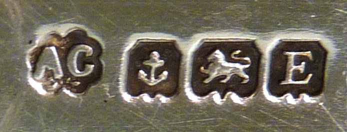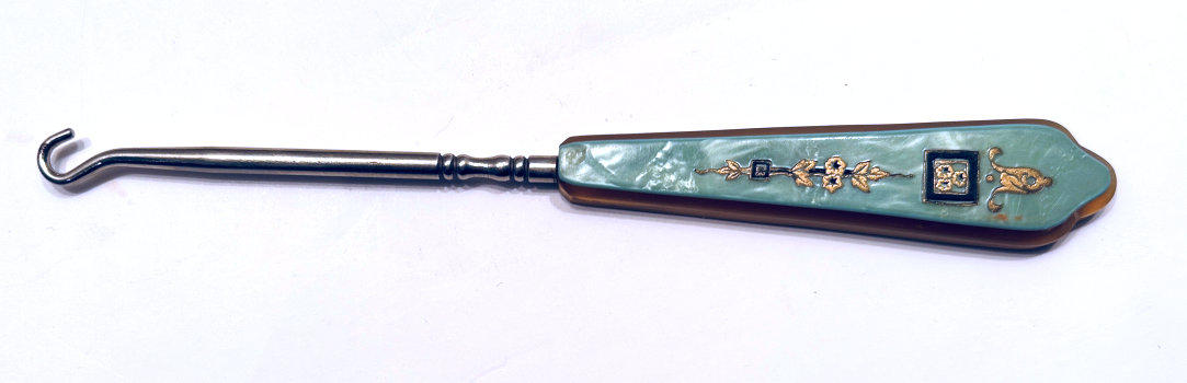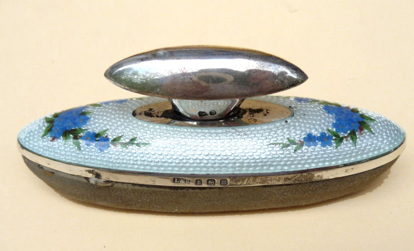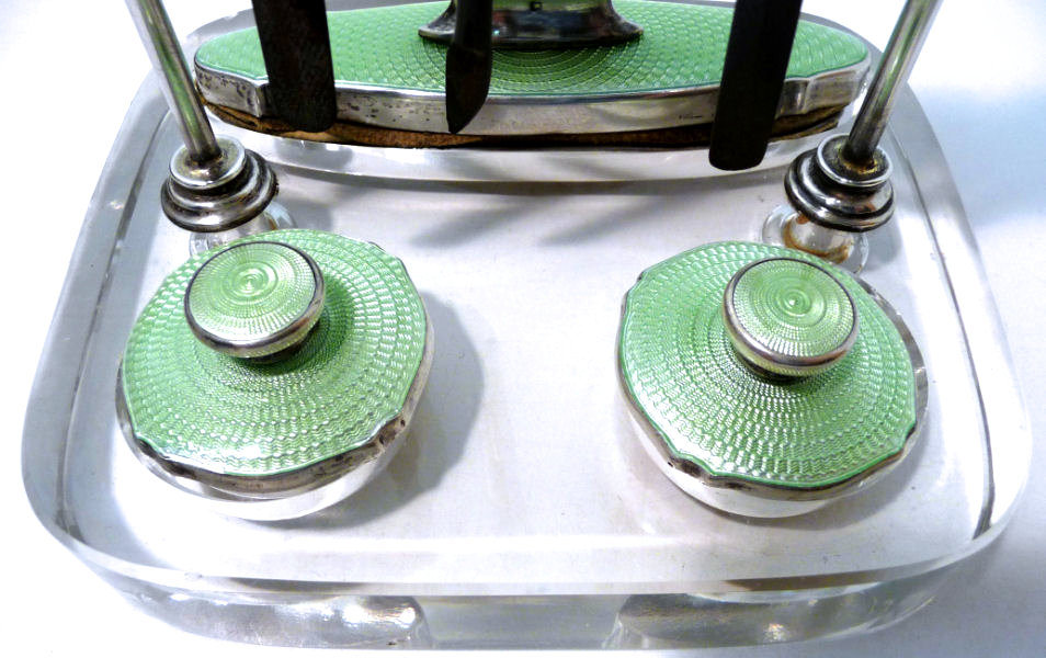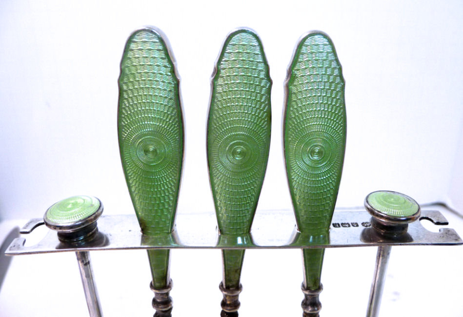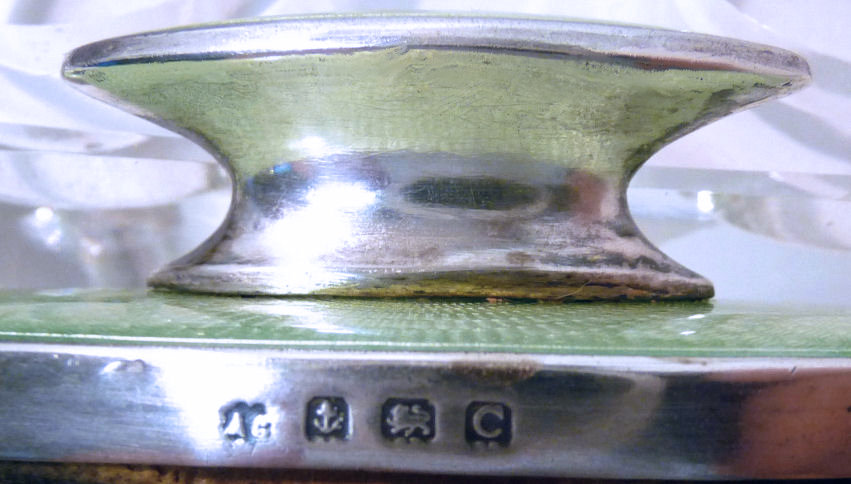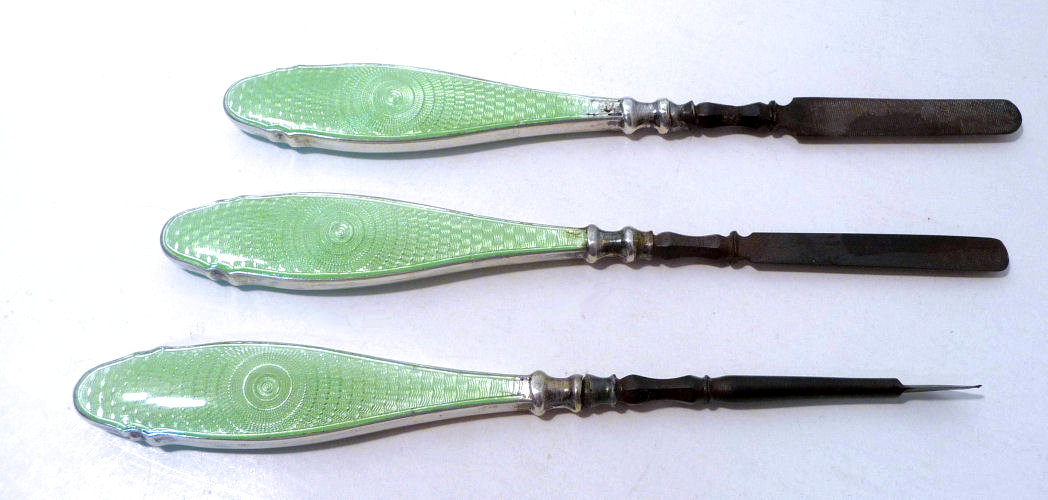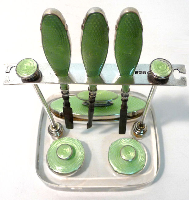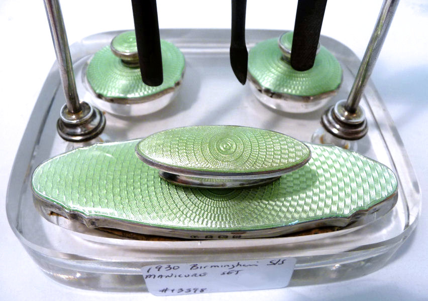This is one of the finest manicure sets I have ever owned and I have had it in my personal collection for over 20 years. It is hallmarked from 1929 and was made by Albert Carter of Birmingham, England. The set consists of several beautiful mint green enamel guilloche on sterling silver pieces including two covered boxes (for rings or patches), a cuticle trimmer, cuticle pusher, a nail file, and nail buffer. Enameling is in very good condition with only a few areas of wear right at the very bottom of the three hanging pieces and one 'spot' on the edge of the file; all in all very minor as most of these sets have very noticeable damage from use. This one is pretty near perfect. The pusher and trimmer are marked "Steel English Make" on the tool ends. The nail buffer bears the hallmarks for Albert Carter and Birmingham 1927. The top bar is hallmarked for 1929 (I know the sticker says 1930 but it is actually 1927 - 1929). The lids for the two covered pots bear the hallmark date for 1928. There are two round buttons at the top of the stand that add to the charm and beautify of this set. The crystal base is 4-1/2" wide x 4" deep x 5/8" high. The height to the top of the stand at the buttons is 5-1/4". The tools are approximately 5-1/2" long x 5/8" wide. The nail buffer is 3-3/4" long x 1-1/4" wide x 1-3/8" high. The pot lids are 1-3/8" diameter. This is a beautiful set and totally usable today. (Click on pic for more photos.) |