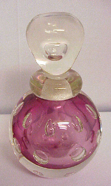 Here is a beautiful LARGE dresser set that I have never seen the likes of before ... done in clear and pink controlled bubble glass, the pieces are quite heavy. These pieces were made in Italy for the Irving W. Rice Co. of New York (Irice). Both pieces are in excellent condition ... perfume dauber intact ... powder has original swansdown puff with pink ribbon inside (feathers are fragile and starting to shed). BOTH pieces retain the original Irice label. Perfume measures 7" tall and powder is 5-1/2" diameter x 4" high approximately. Previously listed for $325 Pair. (Click on pic for more photos.) |
