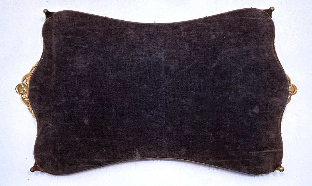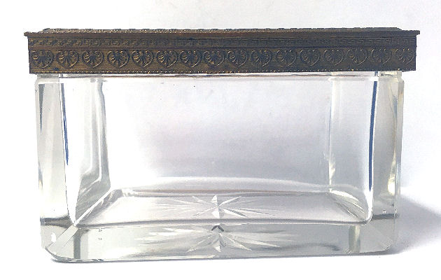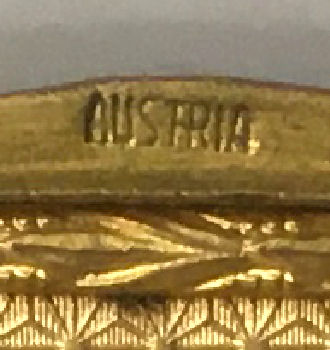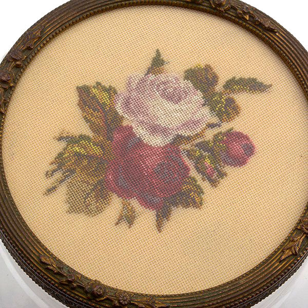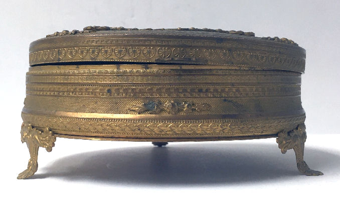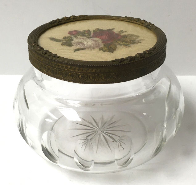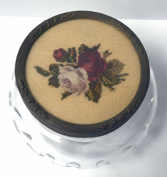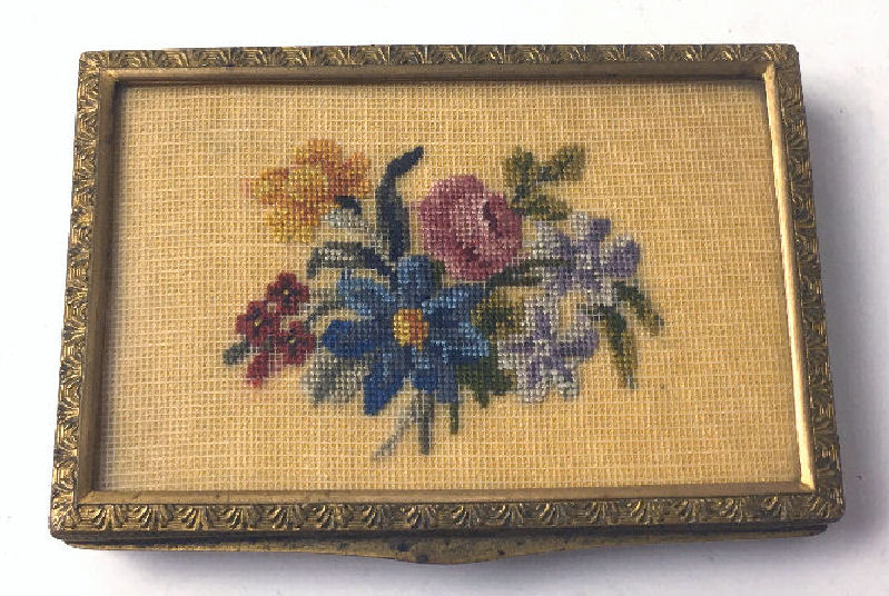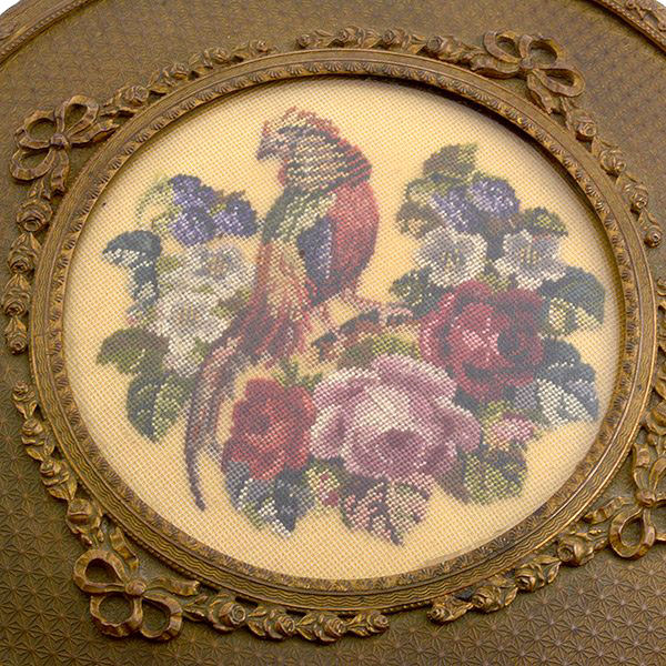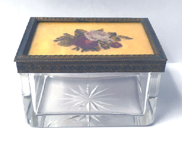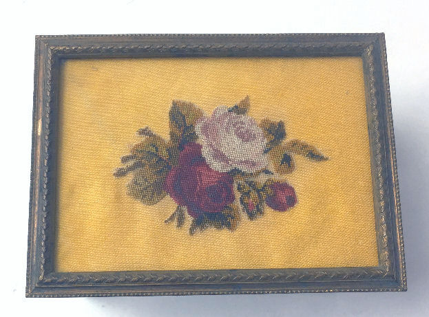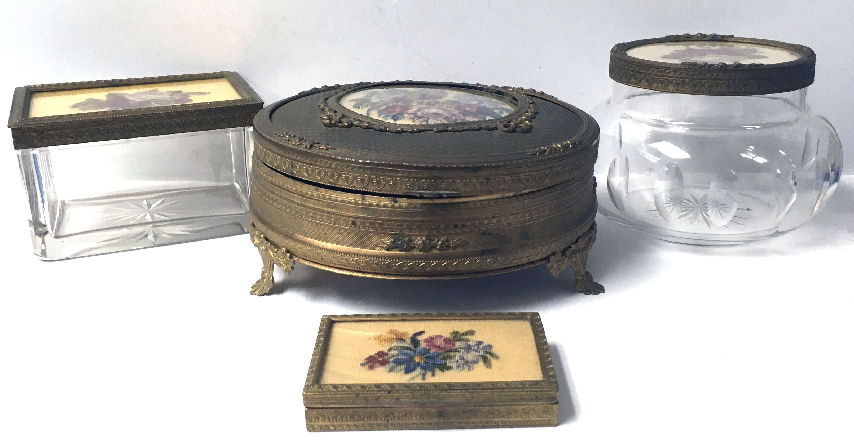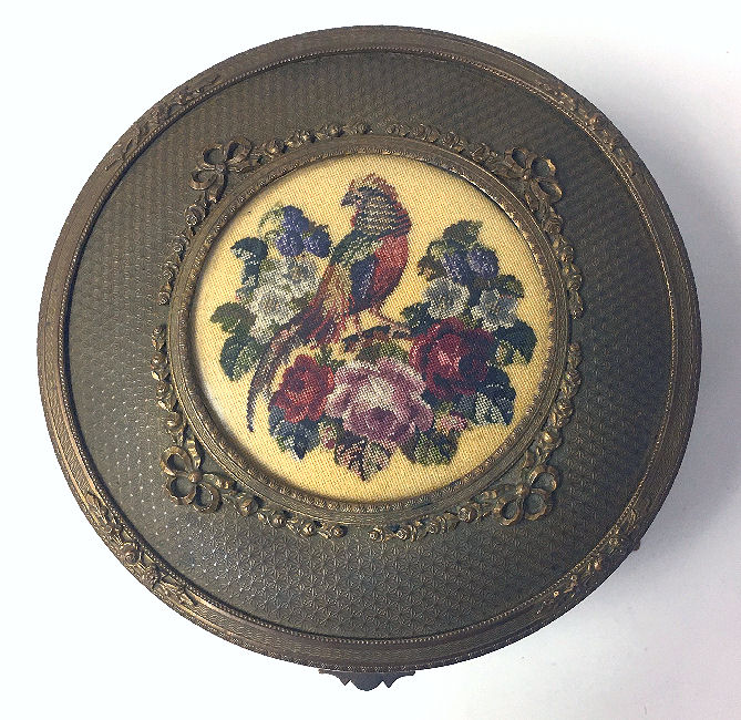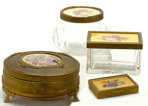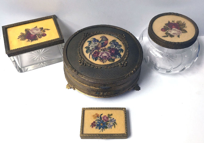 What a lovely set this is! Made in Austria, all four pieces are done in embossed bronze ormolu with hand-embroidered inserts. The large jewelry casket features a parrot nestled amongst flowers. The other three pieces have the flowers without the bird. The set consists of the large footed jewelry casket a covered crystal box, a covered crystal powder jar, and a vanity or calling card case. All of the pieces are in excellent condition and they are all covered with glass tops to protect the delicate handwork. The jewelry casket is velvet lined. The top glass is slipped down a bit on the right side and I have not tried to mess with it as I prefer it as is without tinkering with the lining. All in all this is a great set that would be a beautiful addition to milady's vanity. Pieces and measurements are as follows: