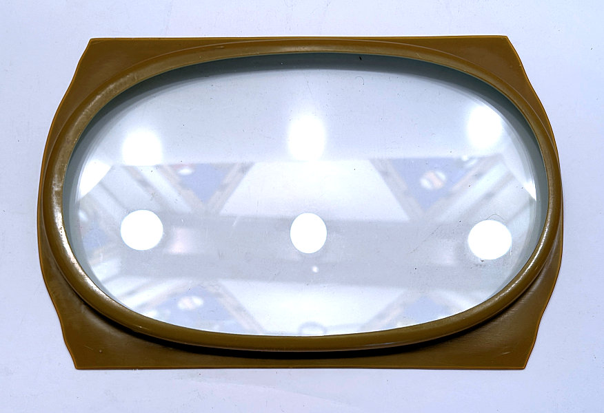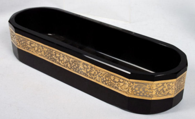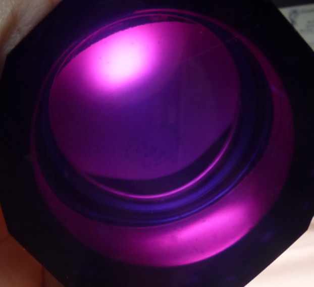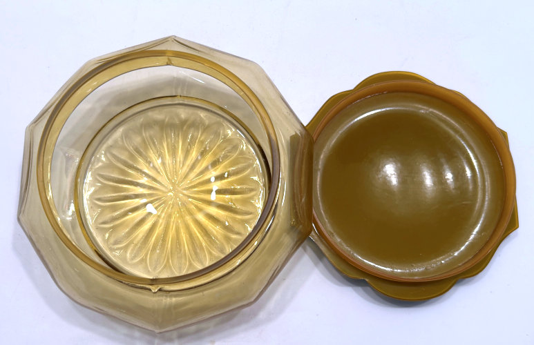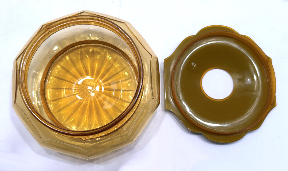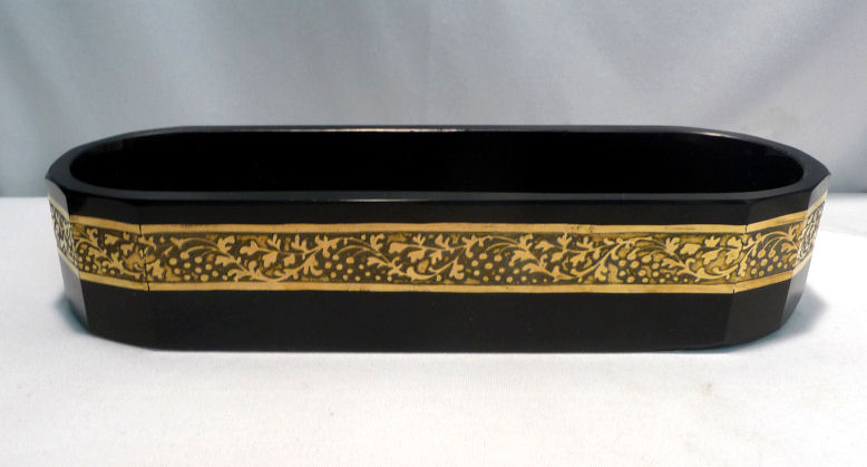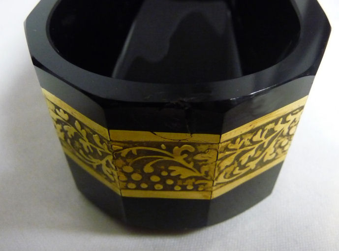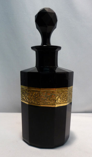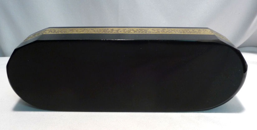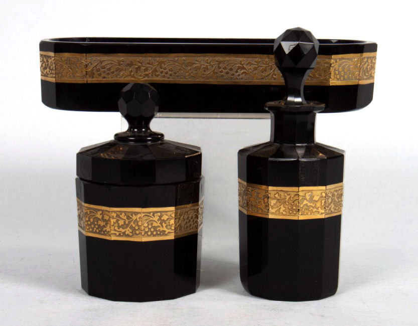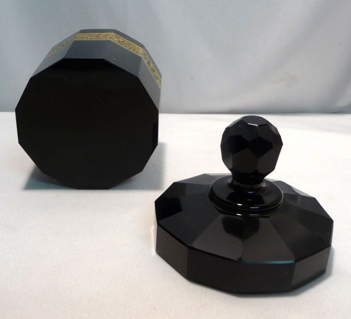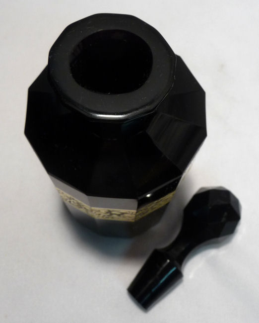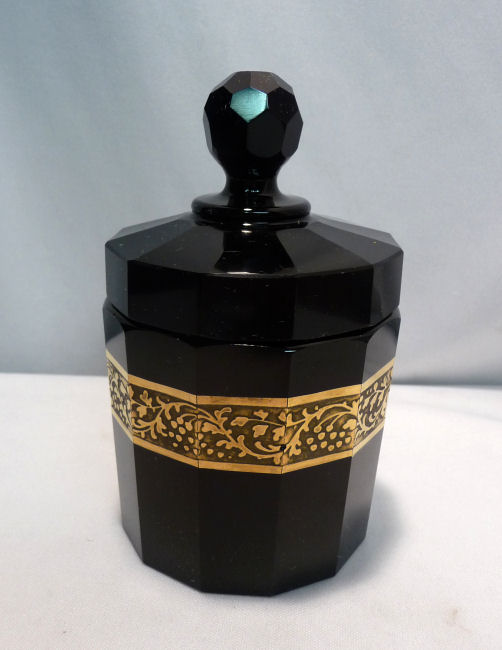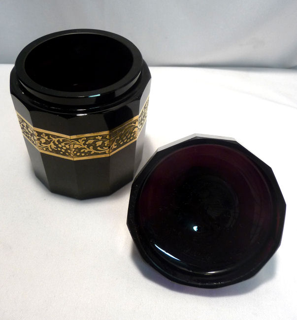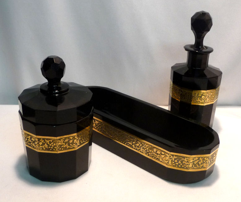 Absolutely gorgeous is this wonderful 3-pc. black amethyst vanity set with gold gilt trim on all the pieces. All of the items are panel cut with polished bottoms and the gold gilt is applied over an etched relief classic design. The stopper of the perfume and the lid on the trinket jar have facet-cut tops and all pieces have polished bottoms. The quality is exquisite and is obviously one of the elegant glassware companies of the early 1900's. Other than very very minor little nips here or there (too small to photograph), the set was in excellent condition until I inadvertently dropped something on the edge of the dresser tray causing a chip which I reglued back on but because of this, I am basically including that piece free of charge and only pricing it based on the other two pieces. The color appears black but when held to light it reflects a deep amethyst color (see photograph of this). The tray measures 8-5/8" long x almost 3" across x 1-3/4" high. Perfume is 2-1/2" diameter x 6-1/4" high. Trinket jar is 3" diameter x 5" high. The set is quite heavy. (Click on pic for more photos.) |