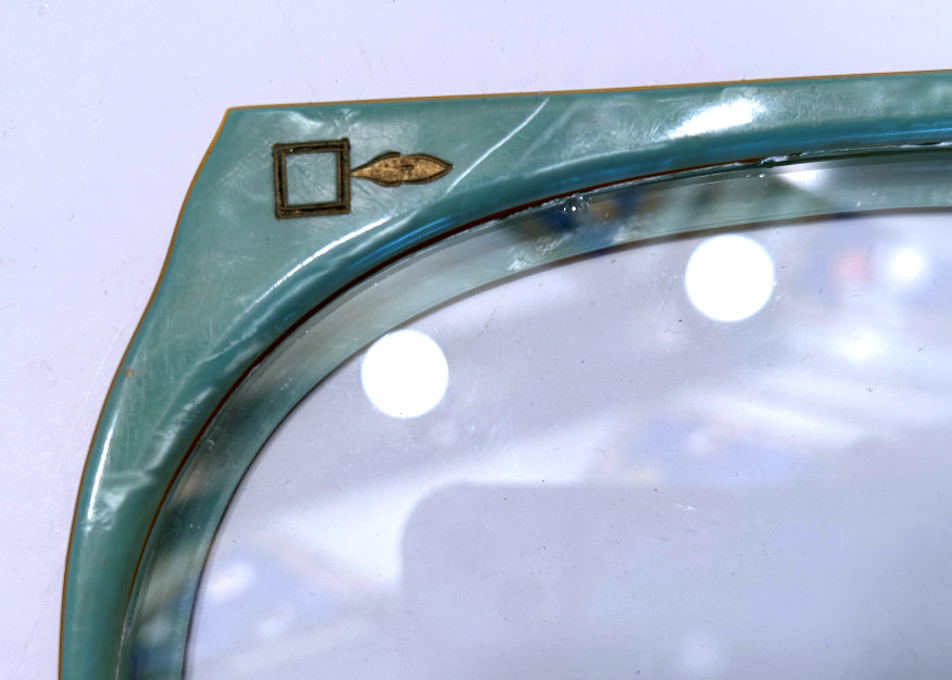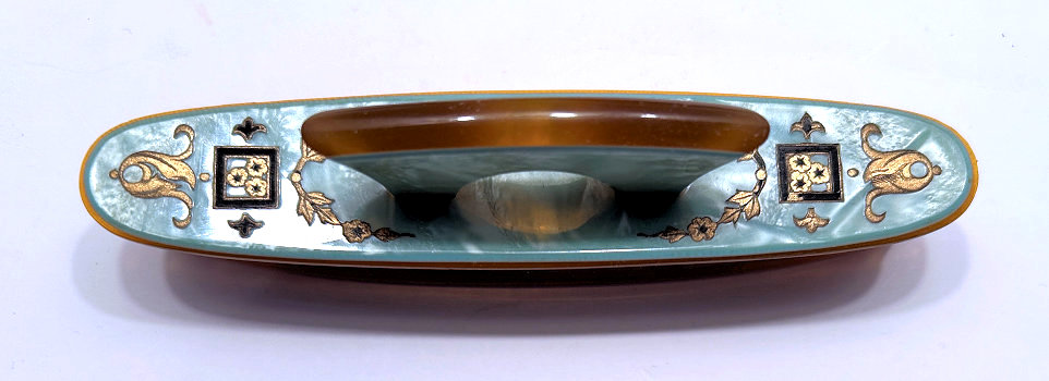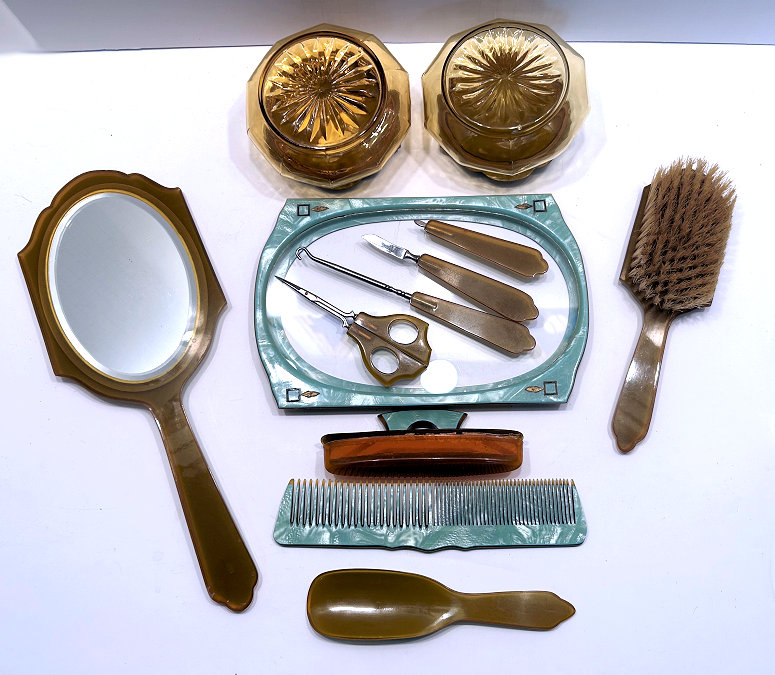 This is a stunning vanity set consisting of 15 pieces (counting lids) in a soft celery green pearlized celluloid with Art Deco etched designs. Overall this set is in great usable condition with virtually no damage (just an edge crack on the lid of hair receiver as shown in the numerous photos). The tray has a glass insert and the beveled mirror is in perfect condition. The glass bases for the powder jar and hair receiver are slightly different as the rim on one has grooves whereas the other does not. Thus the hair receiver lid doesn't snap down totally but does set on the top nicely. Pieces measure as follows: