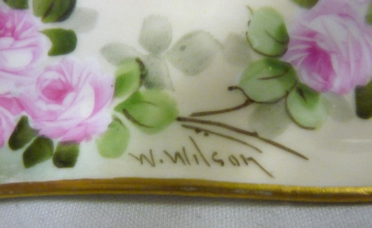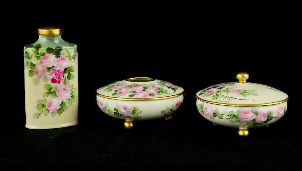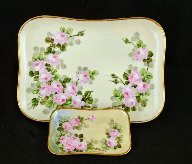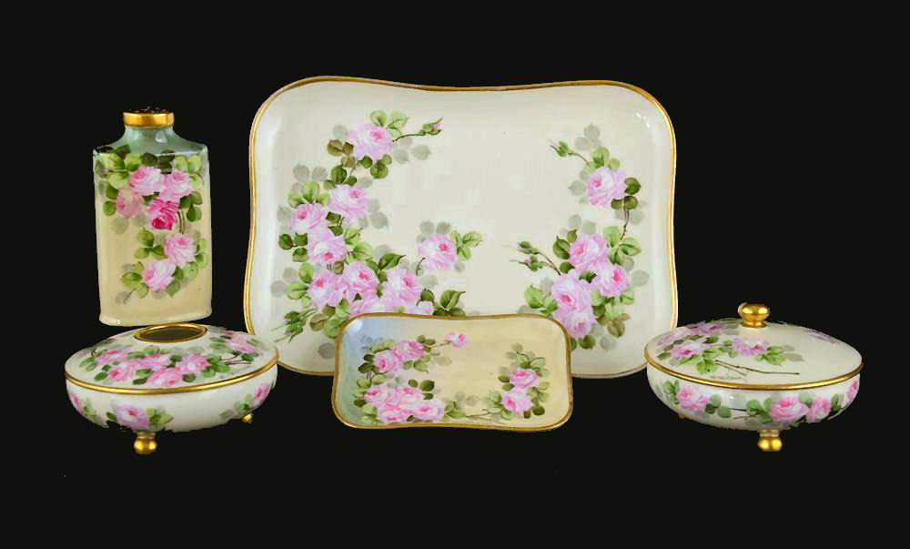 This fabulous vanity set is all hand-painted and artist signed W. Wilson on each piece. The trays and covered jars are all Limoges while the talc shaker bears an Austria hallmark. The beautiful roses are so lifelike and the subtleties in the colors are wonderful. The set consists of a large tray, smaller pin tray, covered powder jar and hair receiver and a rare talc shaker. The two covered pieces each rest on three gold ball feet. All of the pieces are gold trimmed and the entire set is in excellent condition. There are no chips or cracks or damage of any kind. Be sure to look at all the pictures ... and bear in mind that the photos never do justice to the actual beauty of the pieces. Measurements of the pieces are as follows: