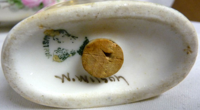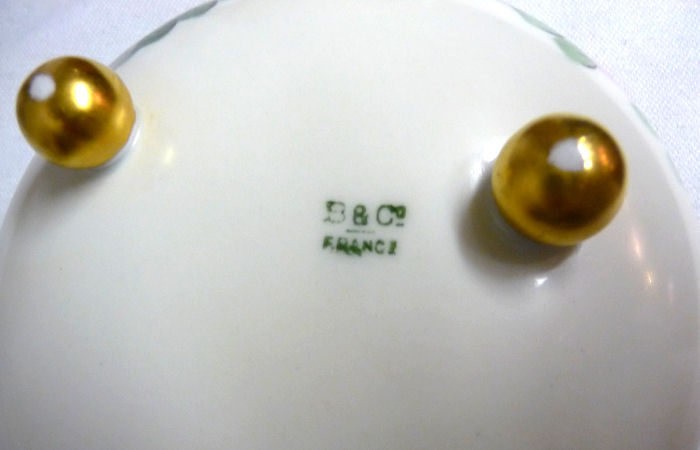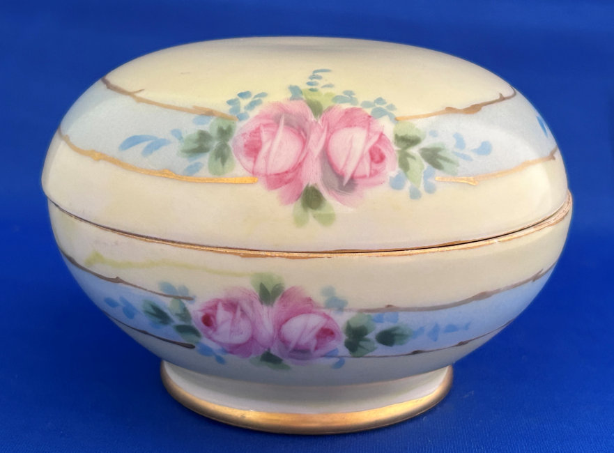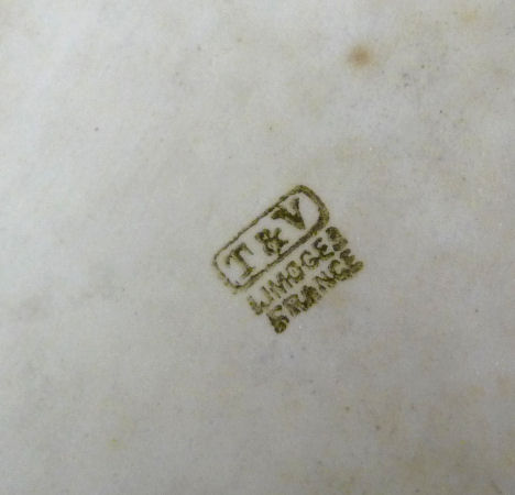 The full marks are on the tray, hatpin holder and powder jar. The other pieces just have the number 0709. Every time I look at this gorgeous set, I feel like I have stepped back in time to that graceful era. It has been in my own collection for many years and now I am ready to pass it along to another lucky owner. Previously listed for $799. (Click on pic for more photos.) |