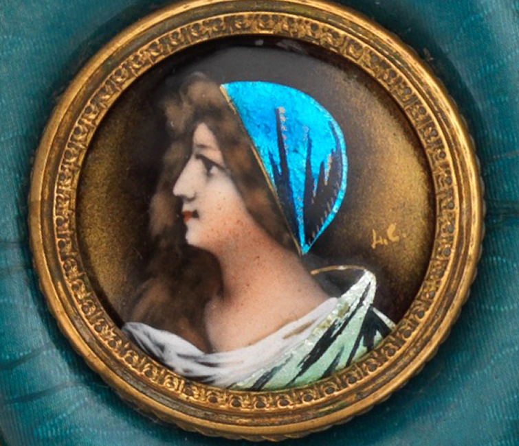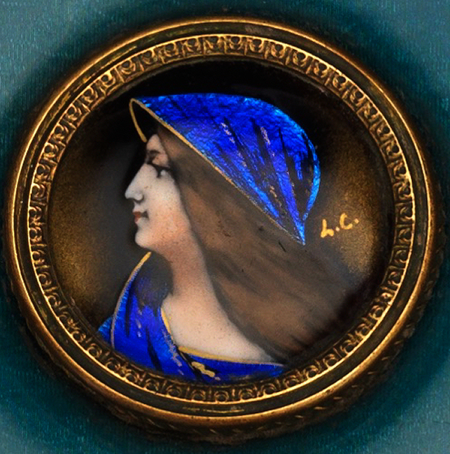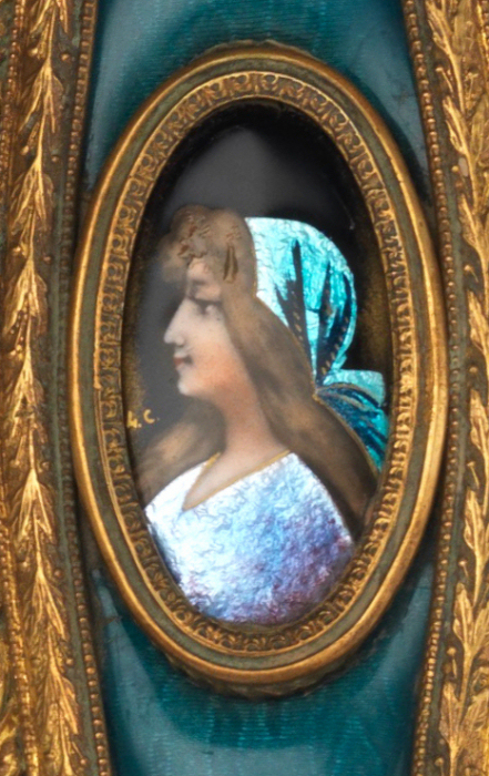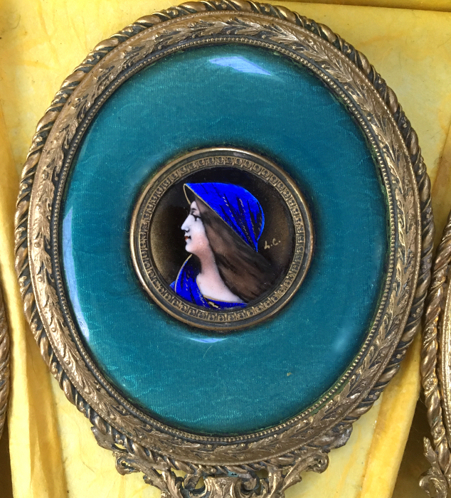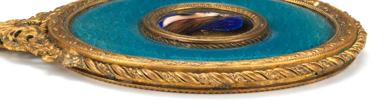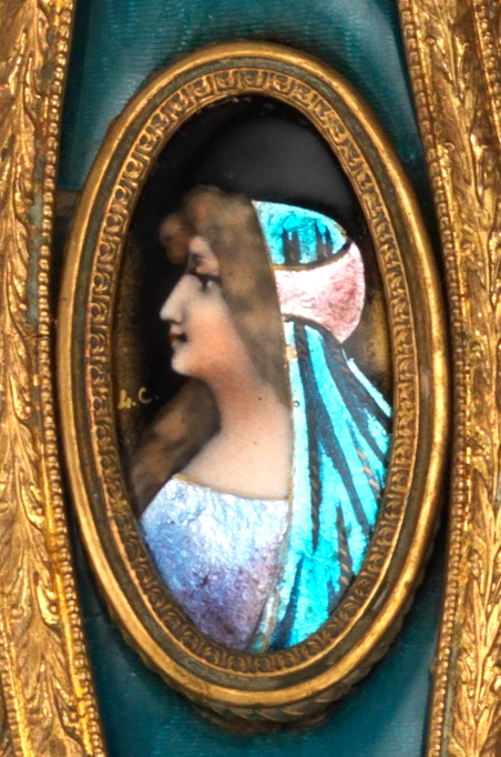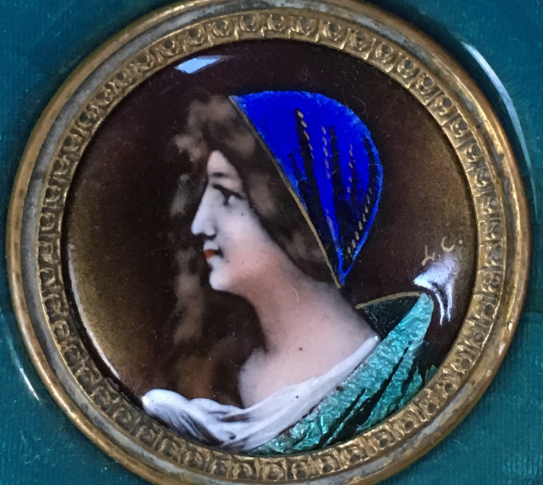This is one of my favorite vanity sets that I have ever owned. When I open the lid to the box, it just literally takes my breath away! The portraits are all richly painted in vibrant shades of blues but what does not show up in the photos is the iridescent foil back enamel used in their clothing and scarves that literally changes color and sparkles like jewels. I wish I could have captured that in the photos but the best I could do was to show the different colors that you will notice as you scroll through the pictures of the same items. The teal enamel guilloche surrounds are done to resemble moire silk ... it is just beautiful! The set consists of four brushes and one hand mirror, each stamped FRANCE, with bronze frames and foil back enamel portraits of beauties, each signed with the intials "H.C." or "L.C.". The set is in excellent condition with some areas of oxidation to gold (I have not polished as I prefer to leave the original gold patination intact for the purist). There are also some very faint fissures (small lines) in the enamel guilloche which you will see in the close-up photos. The beveled mirror is clear but does have some fogging from age and one area of loss at the bottom edge but still totally usable. This set is one of the most beautiful you will ever see! Measurements for each piece are given below. Box measures 12-1/2" x 10-3/4" x 3-1/4" high and opens at top and front. The box is lined in yellow paper which does show some signs of wear.