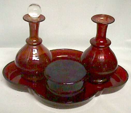 Pretty little ruby flash vanity set consisting of tray, covered powder jar and two perfume bottles. Both stoppers were missing, someone added the clear ball topper which works but is not original to the set. Some wear to the ruby flashing is visible but only upon close inspection. Nice, rich color! Tray measures 10" x 7-3/4", powder jar is 3" x 2-1/4" and perfumes are 5-1/4" without stopper. (Click on pic for more photos.) |
