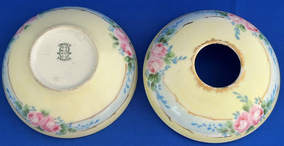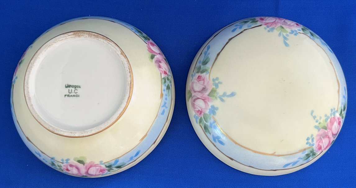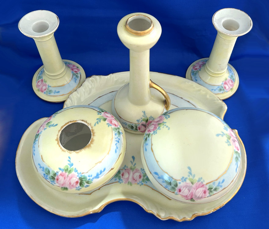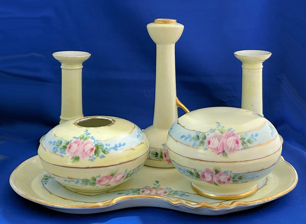 This gorgeous vanity set consists of 8 pieces (counting lids) in a soft pale yellow with hand-painted pink roses on a blue "ribbon" design. The set consists of a tray, covered powder jar, hair receiver, handled bud vase, and pair of candle holders. Truly a gorgeous set made by William Guerin & Co. circa 1901-1932 in Limoges in France (based on the hallmarks). The shaping of the tray is exquisite with beautiful designs. The set has gold gilt trim which shows age-appropriate wear. There are also a few fleabites as will be shown in the photos, but almost all are invisible or barely visible as they are on the insides or near enough to the edges as to be indiscernible. There are no cracks or hairlines anywhere and the set is entirely usable. I have taken MANY photos so please avail yourself of all the images to see the super-sized close-ups of this amazing set. Pieces measure as follows: