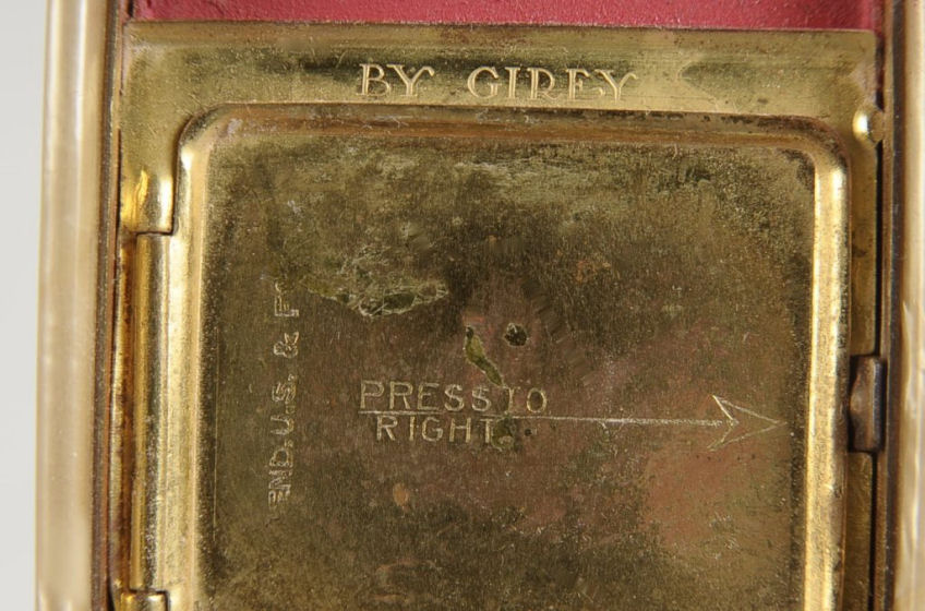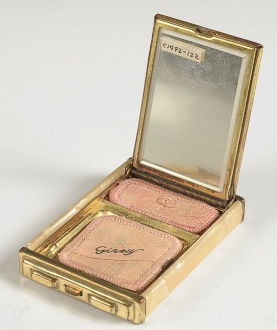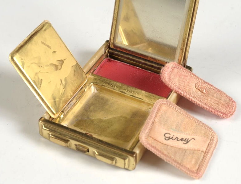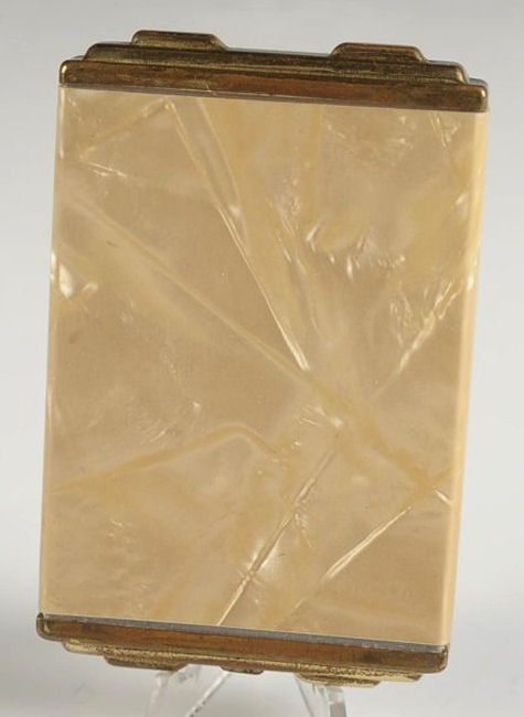 This is a very nice compact by Girey in ivory enamel and faux marble. The front is ivory enamel on brass with engraved design picturing theTravel & Transportation Building. The sides andback of the case are done in ivory faux marble celluloid. Inside the compact is a nicely beveled mirror in the lid with some age foxing. The base has a rouge pot with rouge still intact and covered powder well, both with original puffs. To the naked eye, the compact is in excellent condition ... the photos actually make the front look much worse than it is in person. It is actually very nice. The original blue presentation box is still with it and is in reasonably good shape ... the lid is blue with silver stars. Compact measures 1-7/8" x 2-3/4". Box is 2-3/4" x 4". (Click on pic for more photos.) |