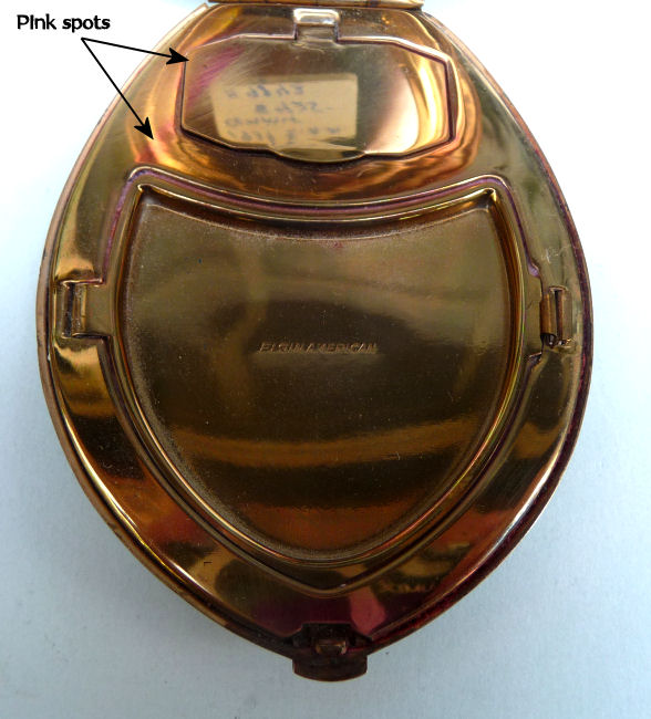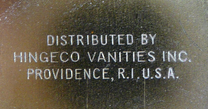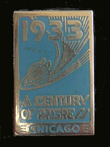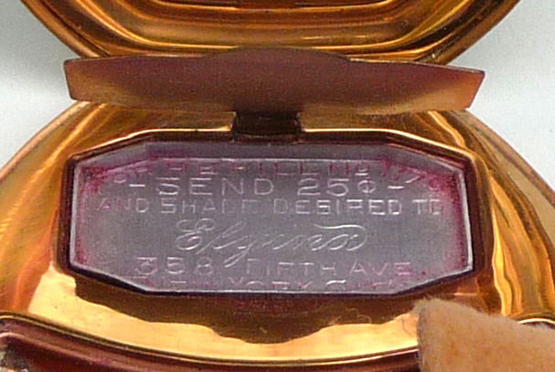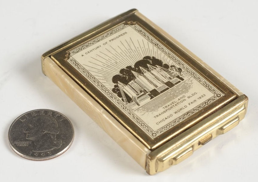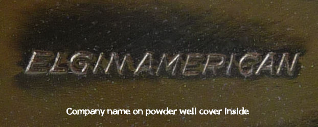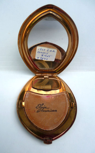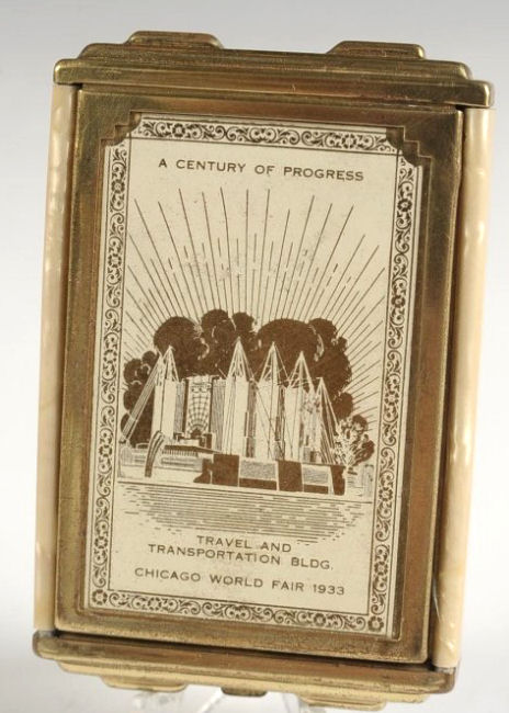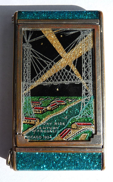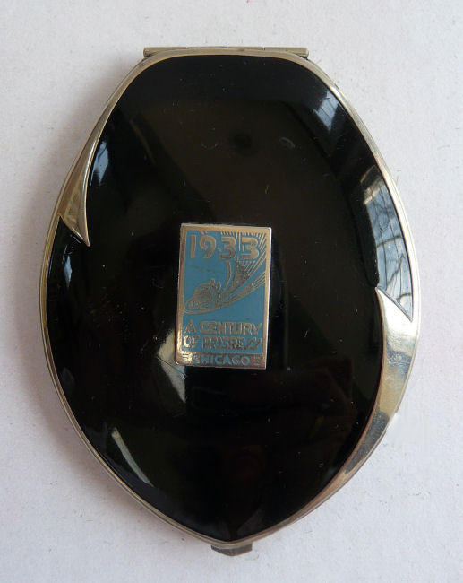 Here we have another Elgin American Chicago world's fair compact. The 1933 Century of Progress emblem is front and center in a jet black background with deco swirling designs. Inside is a mirror holder (the mirror is missing but could be very easily replaced) in the lid and the base has two covered compartments ... one for rouge and one for powder. It is in excellent condition with only some very minor scuffs visible on the black. Compact measures 2-1/2" wide x 3-1/4" high. (Click on pic for more photos.) |