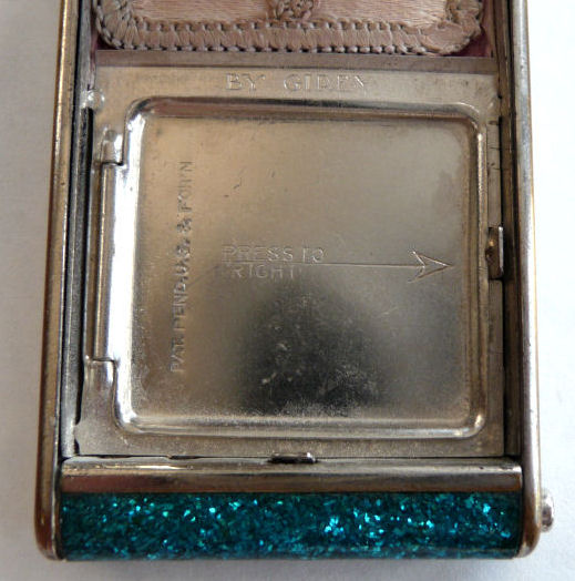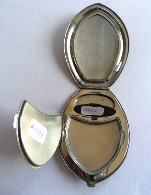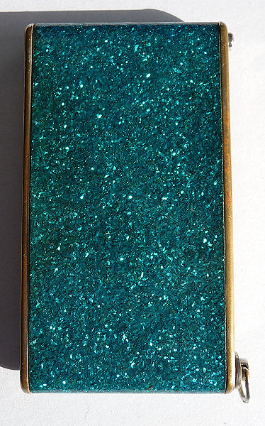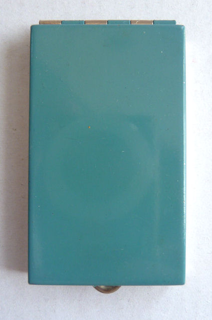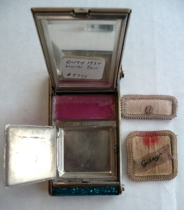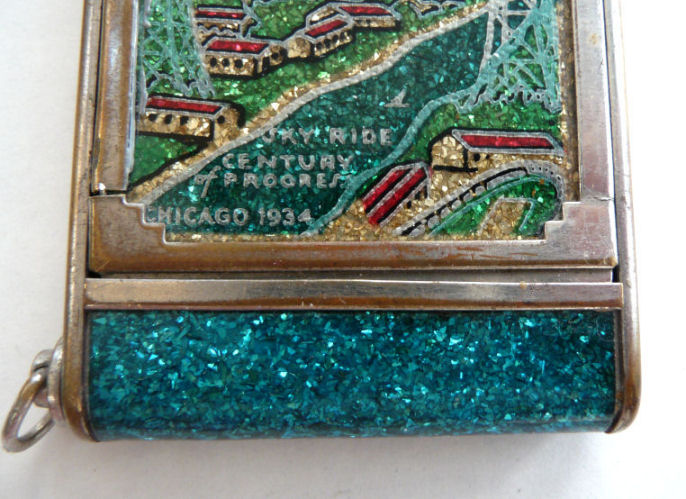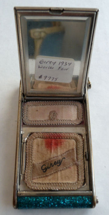 I've had this very pretty Girey camera compact in my collection for many years. The colors in this one are just extraordinary ... turquoise blue case with mica flakes make it sparkle like jewels. The cover depicts the Sky Ride and says Sky Ride, Century of Progress, Chicago, 1934. The interior opens to reveal a nice beveled mirror in the top, rouge pot (rouge still intact) and covered powder pot. Both of the original puffs are still there. Now for the condition: there is normal age appropriate wear to the silver frame as evidenced in the pics. There is a split in the frame (also visible in close-up) right at the hinge point. I have had this repaired so that it works perfectly but the split is still visible. It didn't bother me as the compact is just so unique and pretty that it's not really noticeable. Other than that, the compact is in great shape. It measures 1-3/4" wide x 3-1/4" long. (Click on pic for more photos.) |