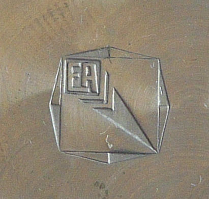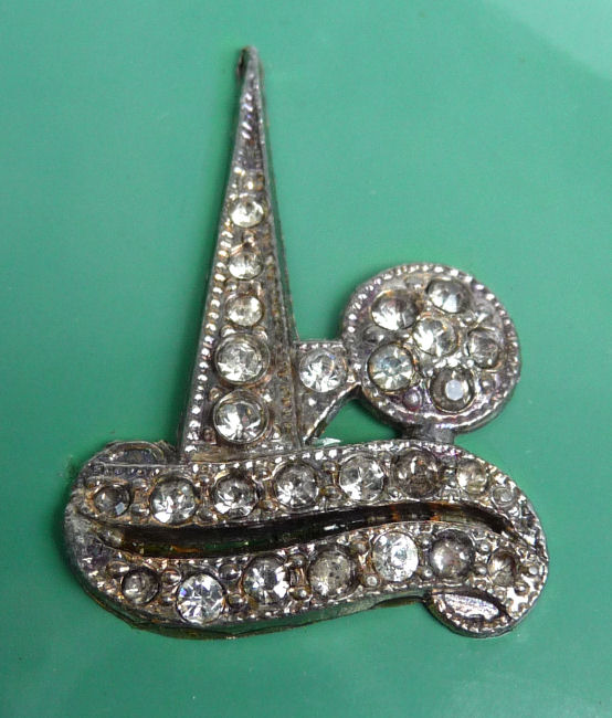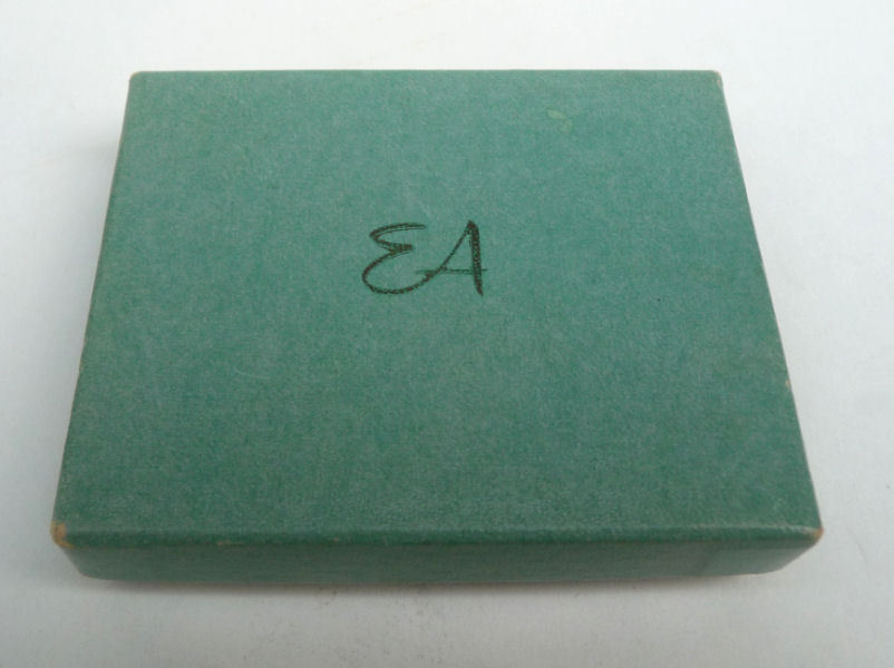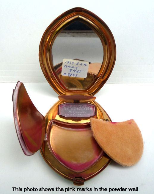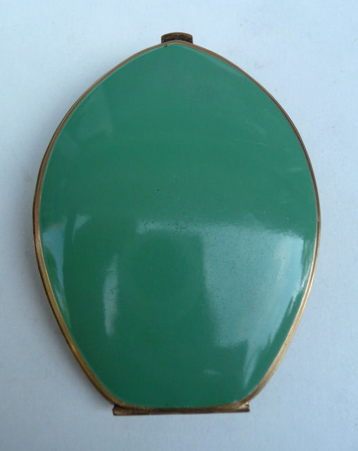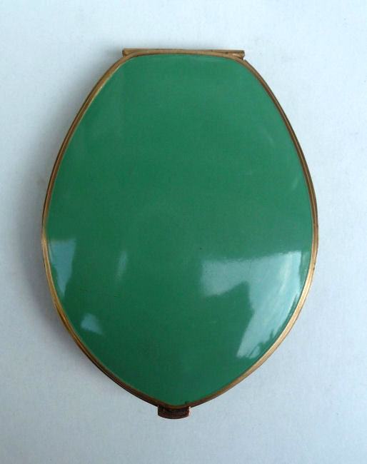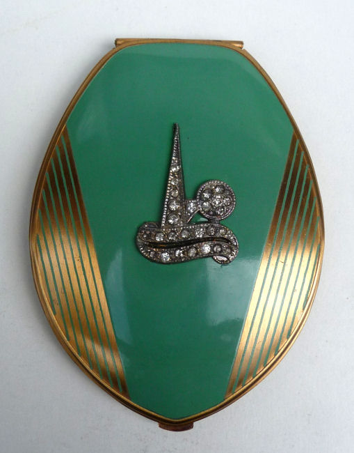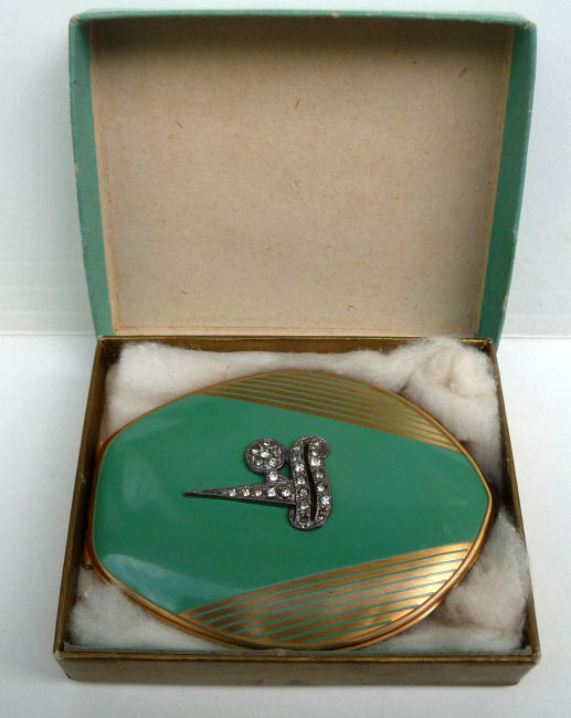 This fantastic compact by Elgin American features a jeweled Trylon and Perisphere from the 1939 New York World's Fair on the lid. The case is a light green enamel with gold deco stripe accents (back of the case is solid green). Inside is a mirror in the lid and the base has two covered compartments ... one for rouge and one for powder. The original powder puff which reads Elgin American is also included and in perfect like-new condition. There is an empty rouge pot as well with refill instructions printed right in the pot. The original box is also green and has the EA emblem on the lid and original cotton wadding inside to cushion the compact. The gold interior has some pink markings in the gold which I have not attempted to remove ... it has a nice patina and I was afraid any rubbing would lighten the brass to a different shade so prefer to leave it as it is. Enameling is all in very good condition with no obvious wear; however, there is one small scratch on the back that I did not even notice until I took the supersized pics for this listing. Compact measures 2-1/2" wide x 3-1/4" high. Box is 3-1/2" x 3". (Click on pic for more photos.) |