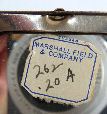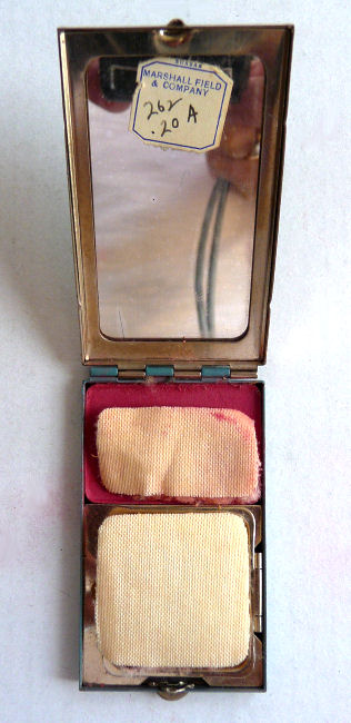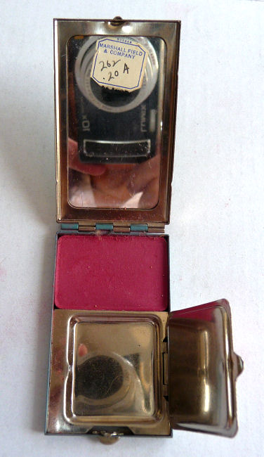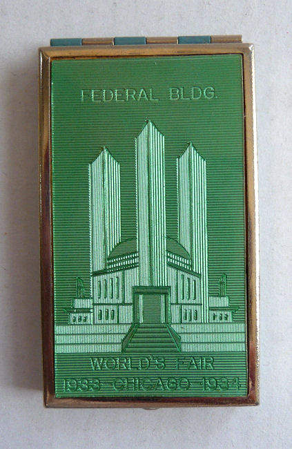 Done in faux enamel guilloche, this cute little compact features the Federal Building on the lid from the 1939 Chicago World's Fair. Back of compact is solid blue. Inside the compact is a mirror in the lid with original store label from Marshall Field & Company. Mirror is in great shape. Bottom has rouge pot (with rouge) and empty covered powder well for loose powder. Two puffs are inside but I can't swear they are original ... may be early replacements. Measures 1-1/2" x 2-1/2" overall. (Click on pic for more photos.) |
