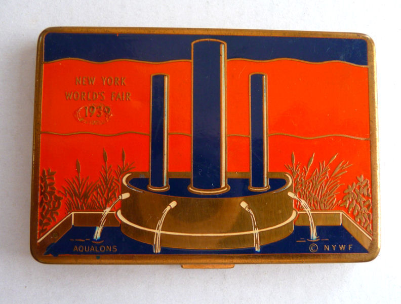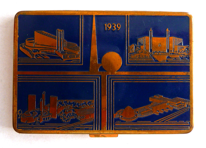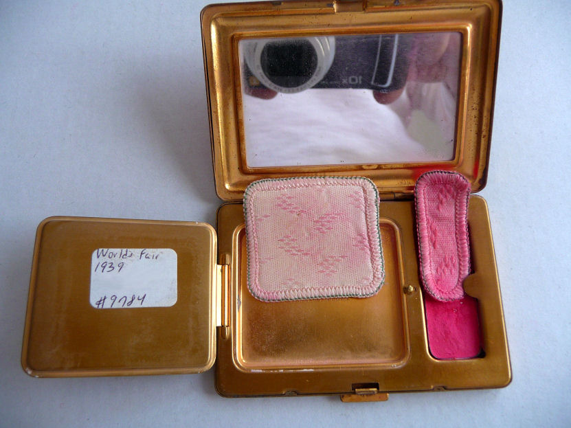 This delightful compact has two completely different decorative sides commemorating different highlights of the 1939 New York World's Fair. The front depicts the Aqualons fountain and the back features four different buildings/pavilions I have yet to identify. Inside is a mirror in the lid and a covered powder well with original puff on one side of the base and rouge pot with puff on the other. It is in very good condition overall with no major problems. Please look at all pics. Measures 3-1/8" x 2-1/4". (Click on pic for more photos.) |